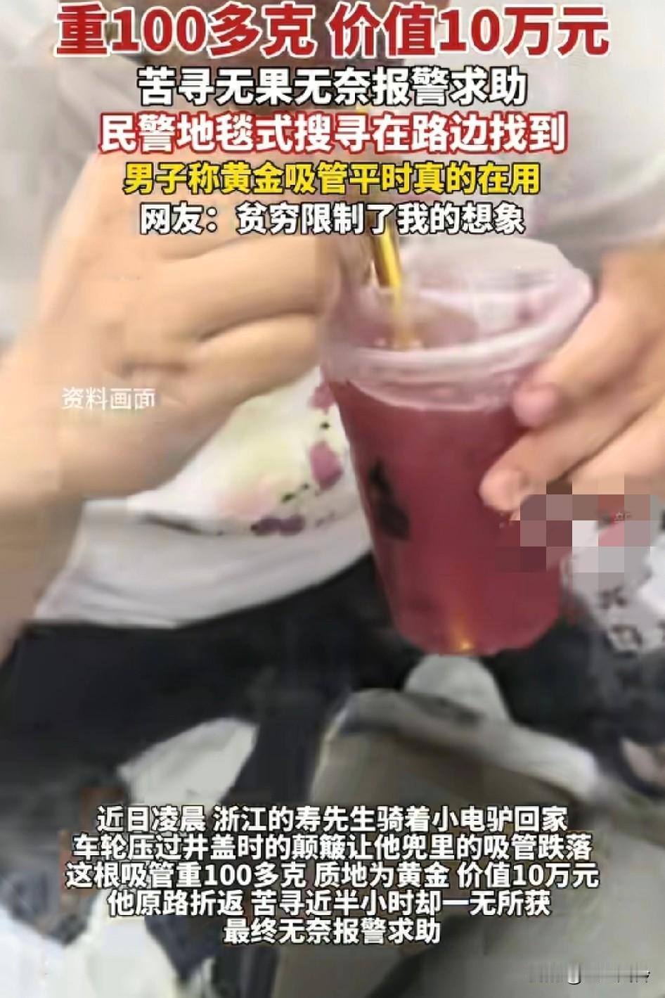 浙江人喝奶茶都用的纯金吸管,一百多克用来喝奶茶,骑电动车,他说他的黄金奥特曼马上就到了 刚要辞职去浙江旅游呢,是不是遍地是黄金啊?丢了就丢了,还去找就不够大气了!另外为叔叔们点赞,人民好卫士。说他穷吧他用一百克黄金当吸管,说他富吧 一个吸管丢了找半个小时,老六