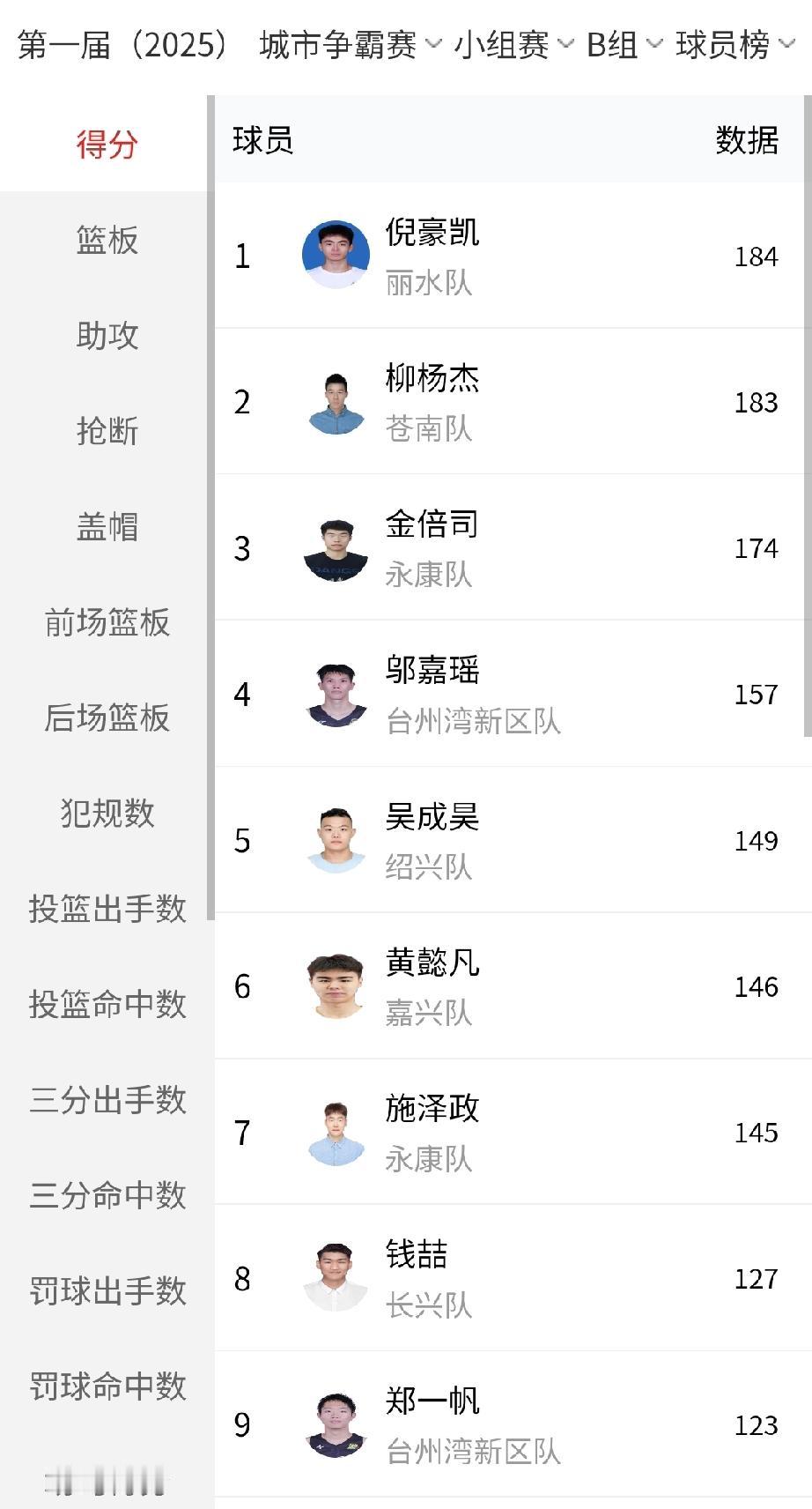 赛季过半,来看看数据榜,顺便分析一下未来各支球队的趋势,看看你心目中的球队有没有入列? 首先来看看目前得分榜前五的球员,分别是丽水队的倪豪凯(场均26.29分),嘉兴经开队的潘承恺(场均26分),湖州队的刘卓(场均22.22分),杭州队的赵哲轩(场均22分),苍南队的柳杨杰(场均20.33分)。其中除了杭州队和苍南队,其他提到的球队还在为出线努力,虽然队内有巨星,但是球队战绩差,依然无用功!篮球是团队运动,我们是要看谁能够笑到最后! 再来看看球队榜,温州队和富阳队都有极大概率完成第一轮的横扫,温州还是湖州要打,富阳还要在主场打一场宁波队,这两场比赛的对手难度其实都不大,所以这两支球队都将以10连胜结束第一轮的比拼! 现在A组的局势情况已经越来越明朗了,基本上温州队,杭州队,诸暨队和金华队出线!B组富阳,苍南和绍兴稳稳出线,永康队丽水队和嘉兴队这三支球队会去争夺最后一个名额!一开始我把绍兴队列到必出线名单里面,很多人还提出质疑,只能说咱们走着瞧!浙ba积分榜 浙BA 温州队