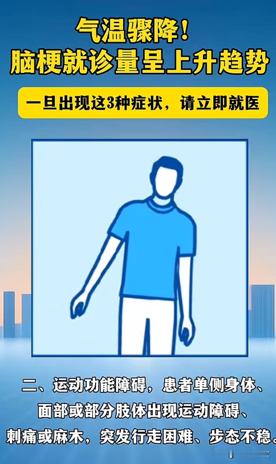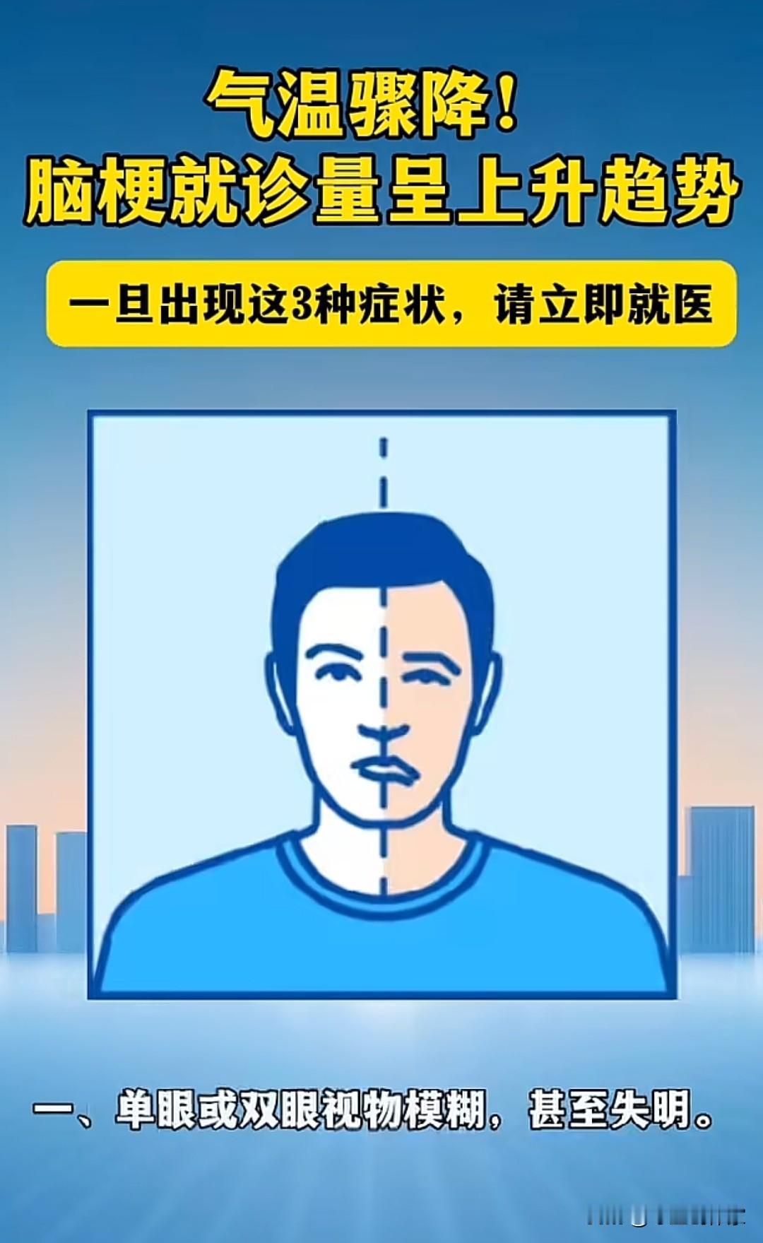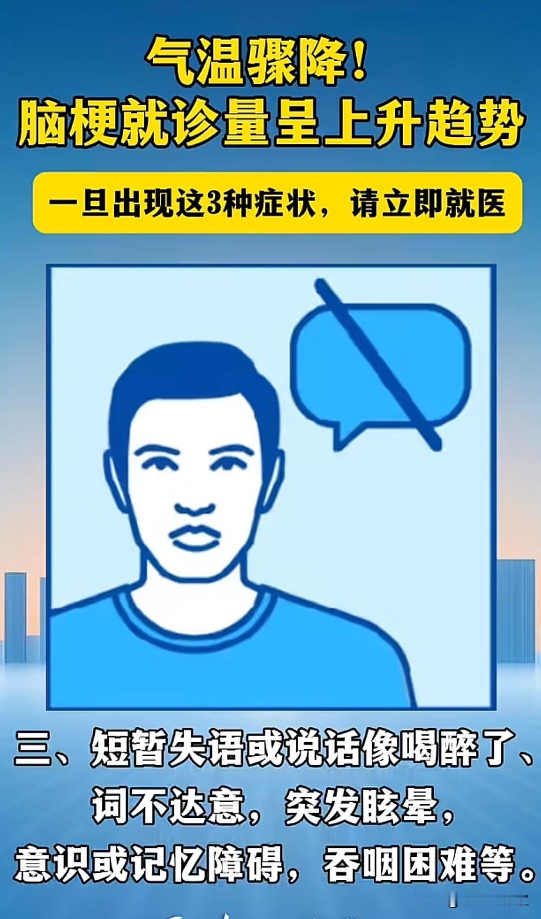气温骤降,预防脑梗! 最近气温骤降,心脑血管疾病又到了高发季节,一旦出现这三种