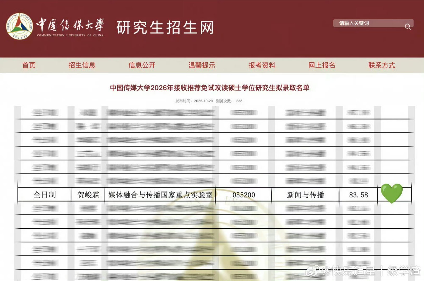 贺峻霖以83.58的复试成绩,中传保研[送花花][送花花]