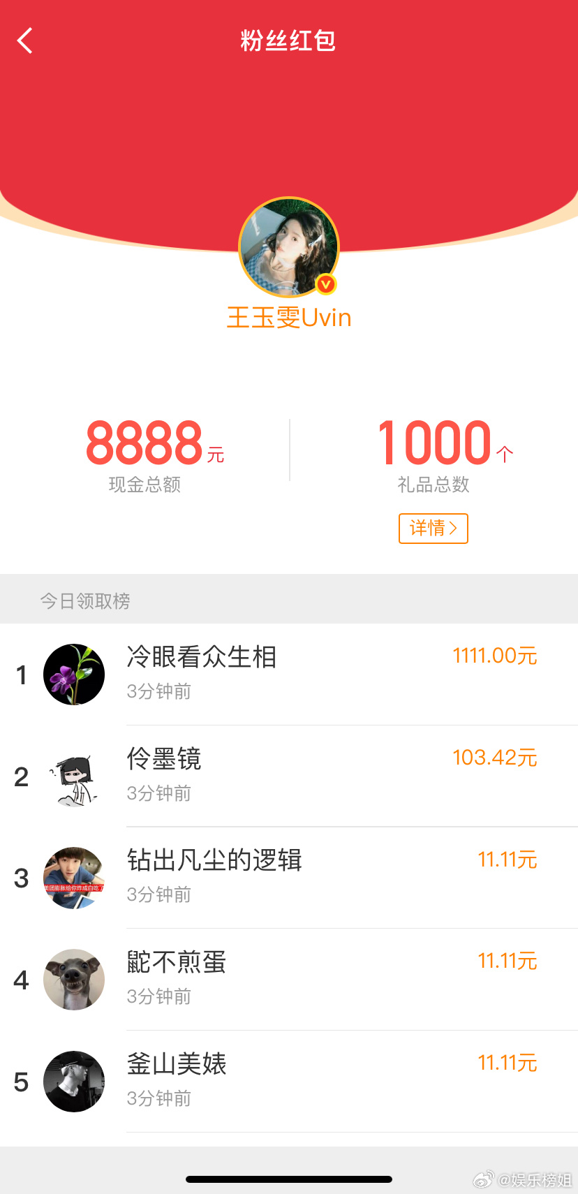 王玉雯发了红包王玉雯发了8888元红包,今天有一份好运,想传递给你~祝大家奔赴热