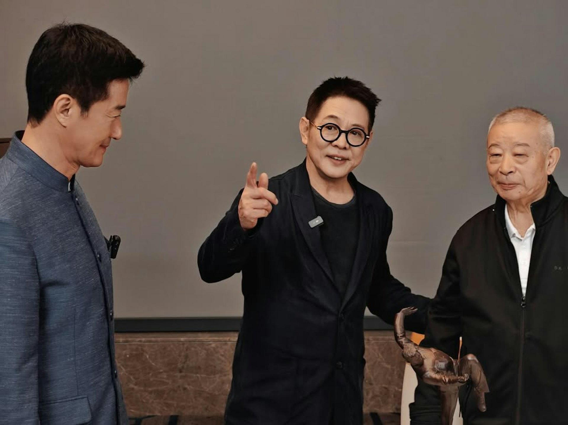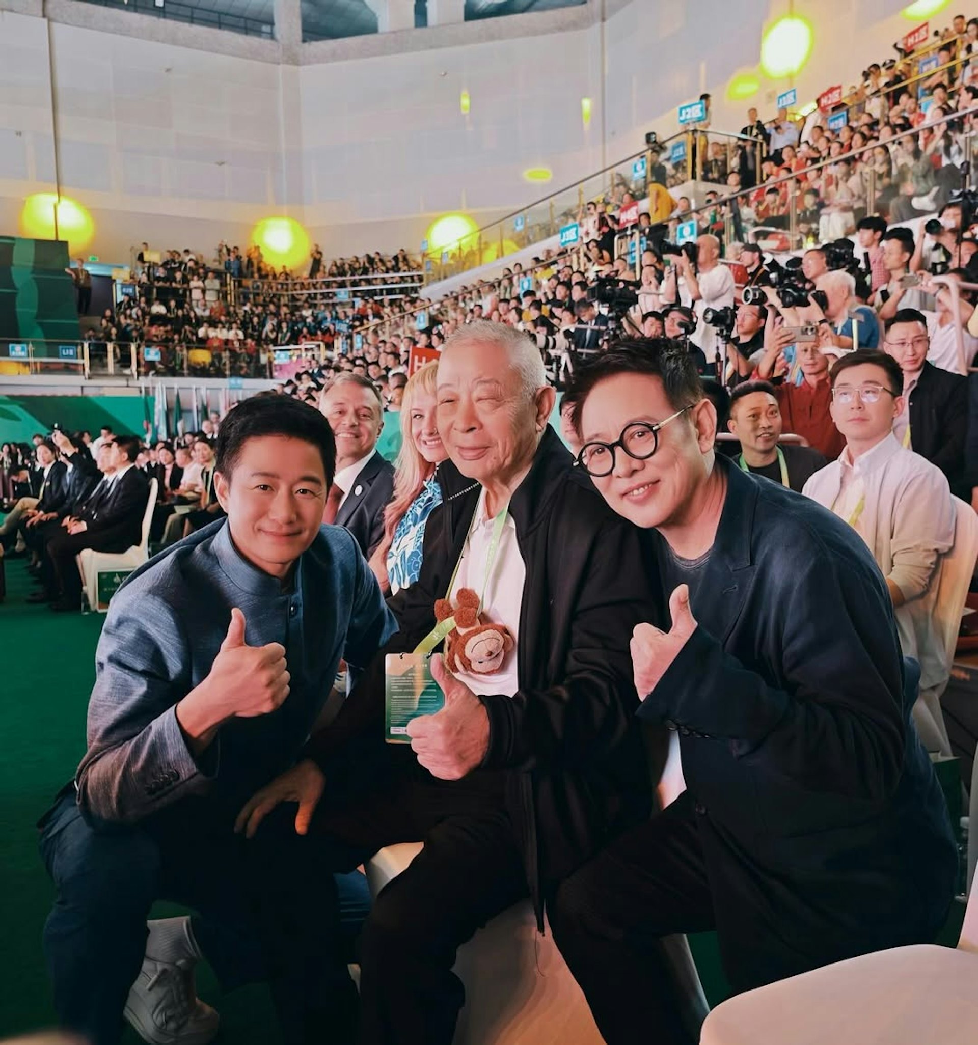 除了重要的交接仪式外,李连杰还与吴京一同与恩师吴彬重聚,三人在赛场看台合影,吴京更单膝跪在恩师面前,十分谦逊恭敬。