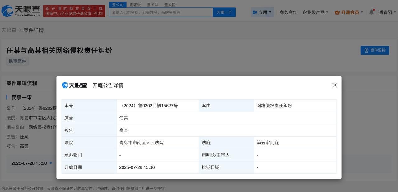 侵权任嘉伦黑粉致歉 侵权任嘉伦黑粉公开道歉信 10月20日,由律师事务所代理的演员任国超(艺名:任嘉伦)网络侵权责任纠纷(名誉权)一案,被告遵照生效法律文书通过涉案账号向任国超先生公开致歉。 天眼查法律诉讼信息显示,近日,任国超(任嘉伦)与高某某相关网络侵权责任纠纷案件新增开庭公告,原告为任国超,该案已于7月28日在青岛市市南区人民法院开庭审理。 天眼查信息: