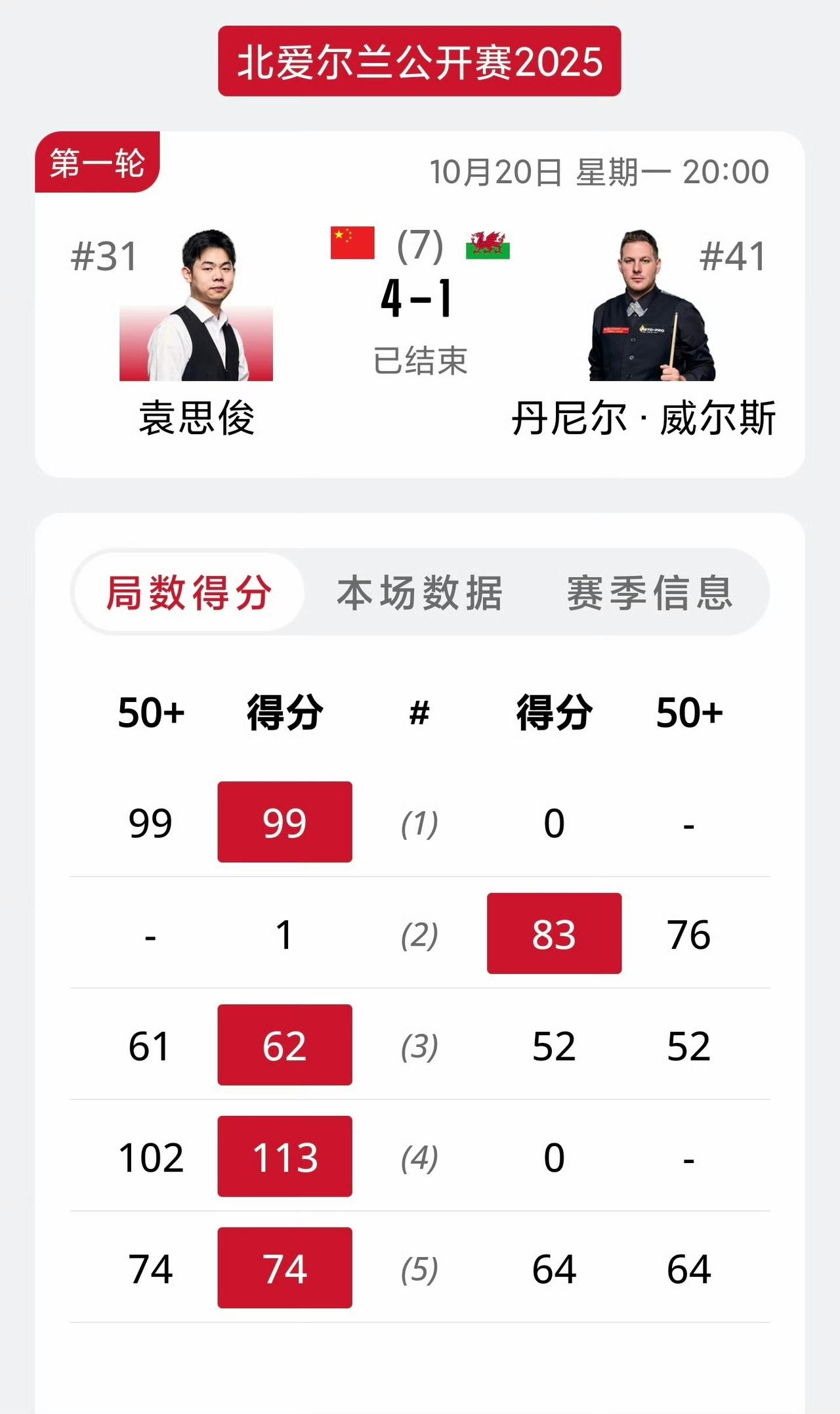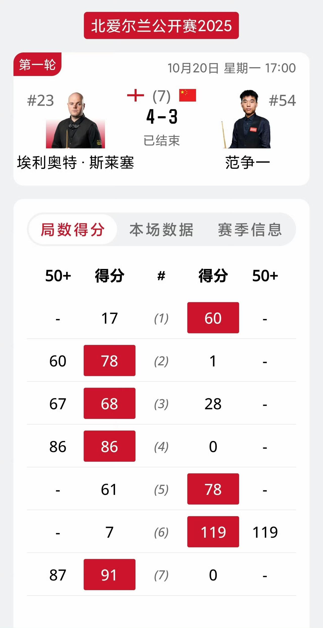2025斯诺克北爱尔兰公开赛首轮,范争一自从拿了冠军后就一蹶不振;袁思俊火力全开