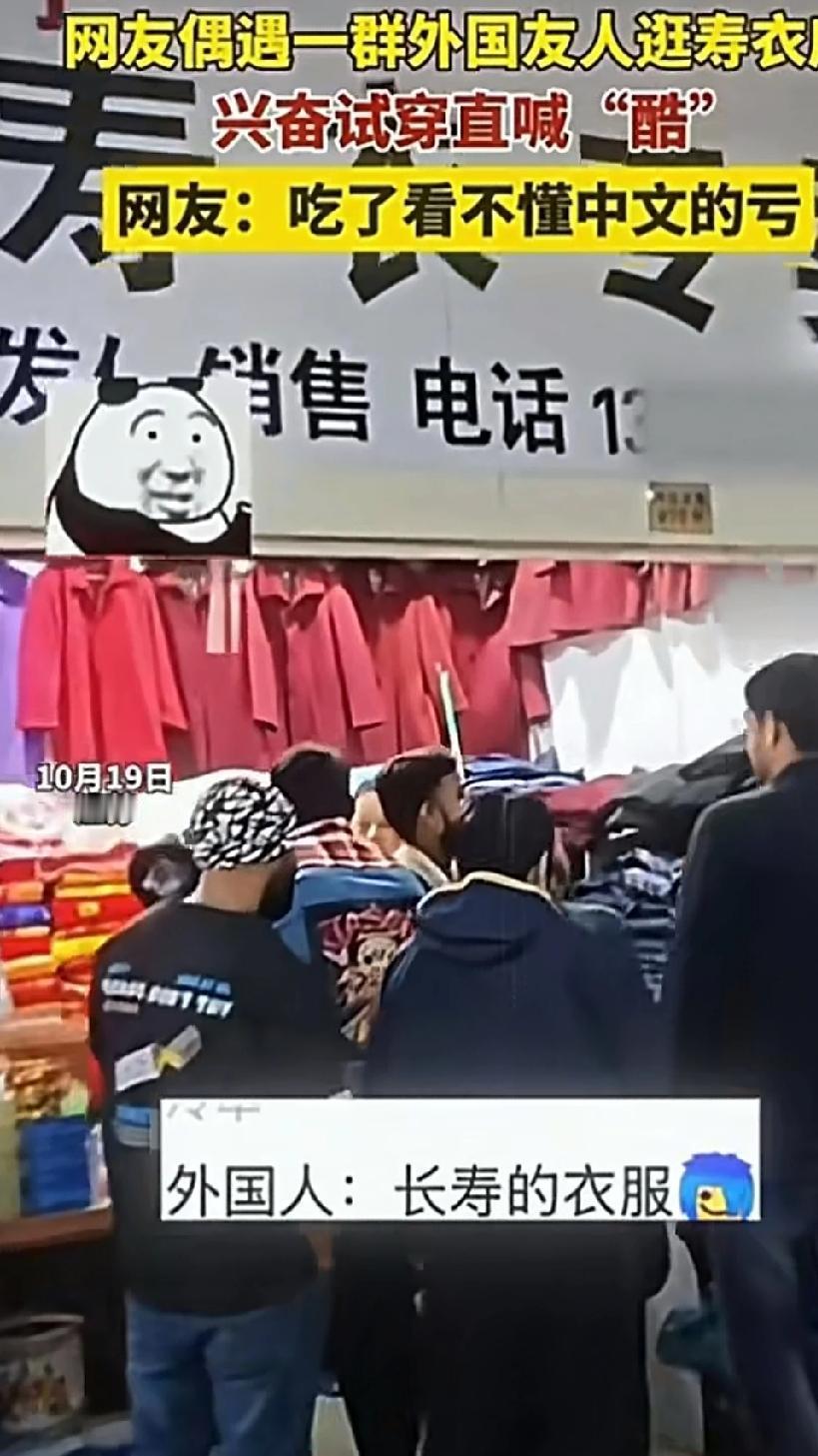 江苏,一寿衣店被外国友人挤满,标价25的帽子只收了15元,几个外国友人试穿寿衣并戴上帽子互相打量兴奋的直喊很“酷”最后只要了帽子戴在头上兴高采烈的走了,快乐就这么简单,在外面友人眼里并不了解寿衣的含义,网友们说吃了看不懂中文的亏,不知者无畏这样也挺好免的外国友人心生疑忌!