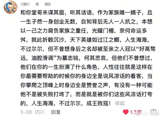 堂哥被大家缅怀,本质就是社会转向期的价值重新定义,大家发现过去普遍高估了自己,低估了社会,把成功想的太理所当然,把赚钱想的太过轻松了。