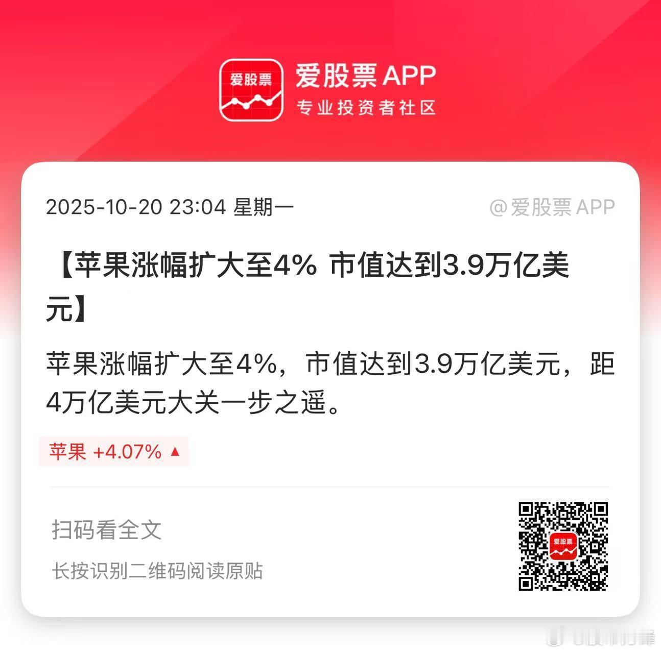 苹果在美股涨超4%,市值3.91万亿美元,仅次于英伟达成为全球第二,距4万亿美元