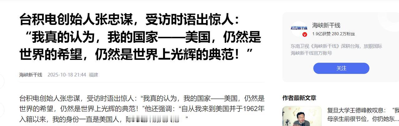 台积电创始人张忠谋,受访时语出惊人:“我真的认为,我的国家——美国,仍然是世界的希望,仍然是世界上光辉的典范!”他还强调:“自从我来到美国并于1962年入籍以来,我的身份一直是美国人,除此之外别无其他!” 94 岁的 “半导体教父” 突然抛出的身份宣言,让全球科技圈再次将目光聚焦到这位台积电创始人身上。 1931 年生于浙江宁波的他,少年时跟着家人颠沛流离,18 岁就被送赴美留学,先读哈佛再转麻省理工,后来又在斯坦福拿下博士学位 —— 这三所美国顶尖学府的履历,可不是随便谁都能拿到的,美国给了他当时在别处得不到的学术平台,这打下的第一印象就带着滤镜。 真正让他和美国彻底绑定的是职场生涯。1958 年他跳槽到德州仪器,这一待就是 25 年,从普通工程师干到统领 4 万人的资深副总裁,成了当时美国大公司里职位最高的华人。 刚进公司不久,他就接手了个烂摊子:IBM 的晶体管良率能到 10%,德州仪器做出来的几乎全是废品。他每天从早盯到晚,硬生生把良率提到 20%,比 IBM 还高,直接拿下第一个管理职位。 后来更是带着团队跳过 1K 产品直接攻 4K 内存,把英特尔打得退出内存市场,这等战绩在美国科技圈挣足了面子。1962 年入籍美国时,他正处在事业上升期,德州仪器还专门出钱送他读博,这种被顶尖平台认可、栽培的经历,让他对 “美国人” 这个身份的认同早刻进了骨子里。 再看他创办的台积电,表面上扎根台湾,实则从头到脚都透着美国印记。1987 年台积电刚起步时,根本没多少人信代工模式,是英特尔的格鲁夫给了第一笔订单 —— 就因为格鲁夫和他私交好,更信得过他在美国攒下的技术口碑。 后来台积电能做大,靠的全是美国客户撑场面:2024 年台积电 70% 的收入都来自北美客户,单苹果一家就占了 25%,等于大半个台积电都靠美国市场喂饱。 技术上更是离不开美国的 “输血”,全球 EDA 软件市场被美国三大巨头垄断了 70% 以上份额,台积电设计 3nm、5nm 芯片的每一步,都得靠这些美国软件模拟验证,没有它们连图纸都画不出来。 就算拿到荷兰 ASML 的 EUV 光刻机,里面关键零部件还是美国产的,美国一句话就能卡脖子。这种 “技术靠美国、市场靠美国” 的处境,让他夸美国是 “光辉典范”,更像是一种对现实的精准描述。 他的行动比言语更诚实。2020 年美国搞芯片法案,台积电立马响应,在亚利桑那州建厂的投资从最初的 120 亿美元一路加到 1650 亿美元,要建 6 座晶圆厂和 2 座封装厂,成了美国史上最大的境外直接投资。 要知道这建厂成本比台湾高得多,良率还没保障,但他照样砸钱 —— 因为美国客户说了,想拿订单就得在美国生产。2019 年美国制裁华为,台积电二话不说断供,当年净利润反而涨了 19%,这波操作更坐实了他优先保美国市场的心思。 即便他后来也说过 “脱钩会伤害所有人”,但身体很诚实,毕竟台积电 66% 的全球代工份额里,大半都是美国科技巨头的订单,得罪美国等于砸自己的饭碗。 他过往的言论更能佐证这份认同。2023 年接受《纽约时报》采访时,他直言 “大陆再多钱也做不出高端芯片”,后来华为 Mate60 Pro 带着 7 纳米芯片现世,算是打了他的脸,但这也暴露了他看问题的视角 —— 完全站在美国主导的技术体系里,压根没料到大陆能靠老设备突围。 更早之前,他还当着佩洛西的面吐槽美国 “靠钱买不来芯片产业”,看似批评,实则是站在美国自己人的角度提建议,潜台词是 “要做就得按美国的规矩来”。 说到底,张忠谋的身份认同从来不是选择题,而是经历和利益堆出来的必然。从 18 岁赴美求学到在德州仪器登顶,从台积电靠美国客户起家到依赖美国技术生存,美国给了他个人成功的所有要素。 对他而言,“美国人” 不只是个身份标签,更是他整个事业版图的根基。所以他说美国是世界的希望,与其说是吹捧,不如说是在陈述一个对他而言的 “事实”—— 毕竟他的人生巅峰、他一手创办的商业帝国,全是在美国搭建的舞台上实现的,这份绑定早已深入骨髓,容不得其他身份的存在。