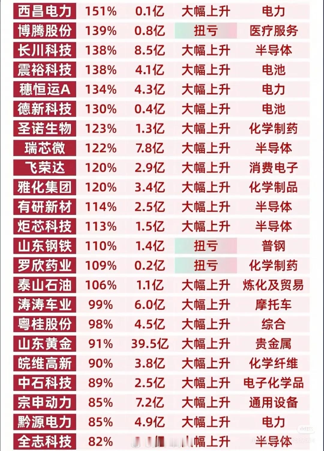4. 扭亏企业亮眼:部分企业不仅实现大幅增长,还从亏损转为盈利,如远大智能、中科三环、博腾股份、山东钢铁等,显示经营状况显著好转。