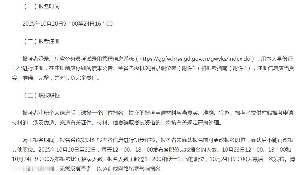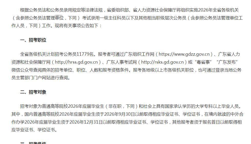 广东省2026年考试录用公务员11779名 广东省2026年考试录用公务员11779名。报名时间2025年10月20日9︰00至24日16︰00。报考者登录广东省公务员考试录用管理信息系统()报名。笔试时间2025年12月7日。广东省考