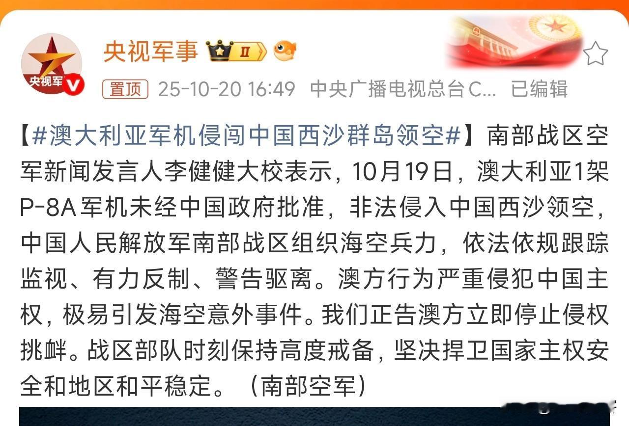 澳大利亚军机侵闯中国西沙群岛领空! 对于澳大利亚这种国家,有网友说直接把澳大利亚的军机打下来,估计不到万不得已,直接打下来的可能性不大。 但是,我们不把澳大利亚的军机打下来,我们也可以做很多事情,比如在太平洋岛国搞点安全设施,可以帮助太平洋岛国救灾的同时,也可以往澳大利亚的领空飞一飞旅游一下,核潜艇也可以到澳大利亚近海潜个水抓几条鱼吃烧烤,或者让我们的航母到澳大利亚转一转游游泳搞个海滨海鲜狂欢派对啥的,也能显示我们对澳大利亚的热爱,毕竟澳大利亚离中国这么近,可以作为中国一个太平洋基地,挺好!