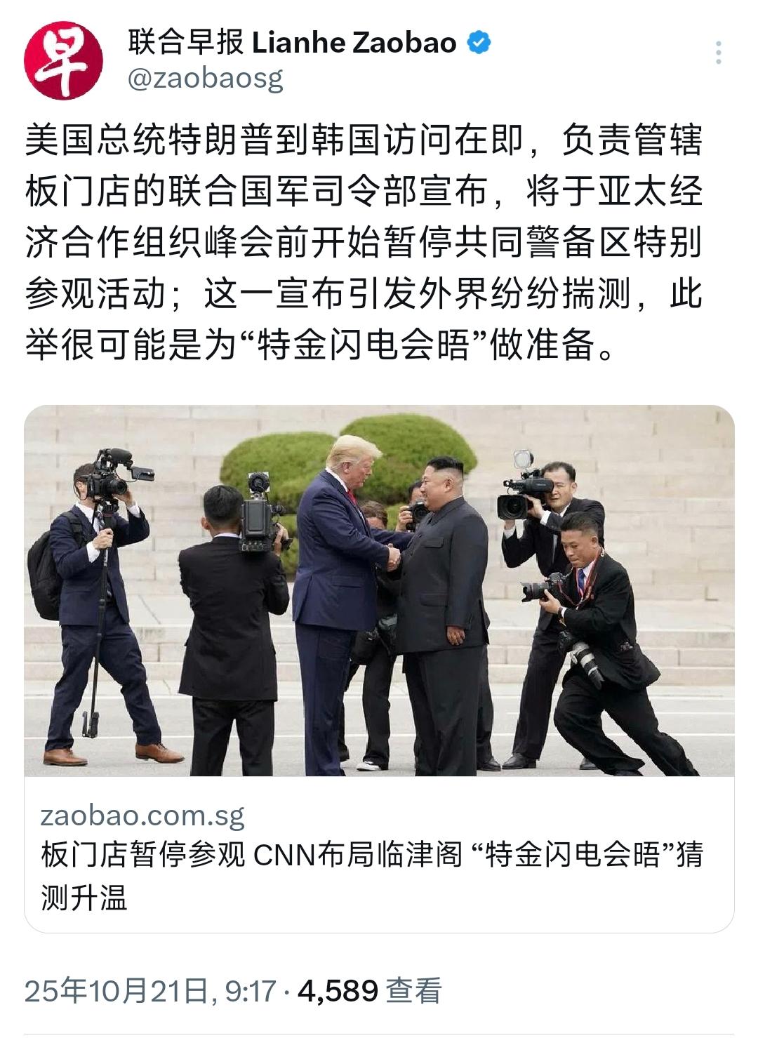 外媒今天(10月21日)报道:“美国总统特朗普到韩国访问在即,负责管辖板门店的联合国军司令部宣布,将于亚太经济合作组织峰会前开始暂停共同警备区特别参观活动;这一宣布引发外界纷纷揣测,此举很可能是为‘特金闪电会晤’做准备。” 自2018年韩朝签署《板门店宣言》后逐步实现非武装化,普通民众和游客曾可通过预约参观。然而,此次联合国军司令部不仅提前关闭了参观通道,还强调“暂停期间将严格管控人员流动”。 据韩联社披露,该项目原每日开放两梯次、共40人参观,如今却因“安全审查”戛然而止。更微妙的是,CNN被曝已租下京畿道坡州市临津阁内最北端的咖啡馆露台——该位置恰能俯瞰板门店全景,这一细节被解读为媒体为可能的突发新闻提前抢占机位。 事件的背景可追溯至更早的博弈。自特朗普重新执政以来,美朝互动始终笼罩在迷雾中。2025年9月,韩国总统李在明访美时曾暗示,特朗普可能在APEC期间与金正恩会面。 而特朗普本人也多次表达会面意向,甚至试图通过亲笔信传递善意,但均遭朝方婉拒。此次APEC峰会定于10月31日在庆州举行,特朗普的访问时间被锁定在29日至30日,恰好卡在峰会前夕。这种时间上的“巧合”,让外界不禁联想:是否有人试图利用国际会议的掩护,完成一场不被过度聚焦的高层对话? 从历史经验看,板门店向来是美朝领导人“闪电会晤”的首选地。2019年6月,特朗普与金正恩的第三次会面便在此地完成,全程未经过繁杂的外交磋商。 这种“即兴式”接触既符合特朗普打破常规的行事风格,也能最大限度降低国内反对势力的干扰。如今,朝鲜已获得中俄在九三阅兵仪式上的公开支持,金正恩若选择此时会面,既能掌握对美谈判的主动权,又能向国际社会展示其外交灵活性。 而特朗普则面临国内大选压力,若能在任内推动朝鲜无核化取得实质进展,无疑将为其政治遗产添上浓墨重彩的一笔。 不过,这场潜在会晤的障碍同样显著。首先,朝鲜方面至今未释放金正恩将出席APEC的信号。根据惯例,朝方通常在会议前一周才确认领导人行程,这种“拖延战术”既保留了谈判空间,也避免了过早暴露意图。 其次美国内部对会晤态度分裂。国防部东亚事务副助理部长约翰·诺近期在国会宣称,韩国应“大幅增加国防开支并协助遏制中国”,这种将半岛问题与大国博弈捆绑的言论,可能激化朝鲜的安全顾虑。 更关键的是,特朗普政府尚未启动会晤的后勤规划,美朝双方也未展开任何实质性沟通,这些技术性障碍让会晤成行概率大打折扣。 值得玩味的是,韩国在此次事件中的角色。统一部长官郑东泳曾表示,APEC峰会可能是促成美朝会晤的契机,但李在明政府近期却因美国以“非法移民”为由逮捕数百名韩籍公民而陷入外交尴尬。 这种“盟友间的手铐事件”暴露了美韩关系的裂痕,也让韩国对特朗普的“惊喜外交”心存疑虑——若会晤失败,首尔是否要为华盛顿的冲动买单? 目前,所有猜测仍停留在“可能性”层面。但可以确定的是,板门店参观的暂停、媒体的异常部署、历史经验的映射,以及各方势力的暗流涌动,已让这场潜在会晤成为亚太地区最受瞩目的政治事件。 无论最终是否成行,它都折射出当前国际格局的复杂性:大国博弈、领导人个人意志、地缘安全诉求交织在一起,让每一次高层互动都可能成为改变局势的支点。 当特朗普的专机降落在韩国土地上时,板门店的咖啡馆露台是否会见证历史性的一刻?朝鲜的沉默是谨慎还是拒绝?美国的筹备是真心推动和平还是政治作秀?这些问题的答案,或许要等到APEC峰会闭幕才能揭晓。 那么,您认为这场“特金会晤”会成真吗?欢迎在评论区分享您的看法。