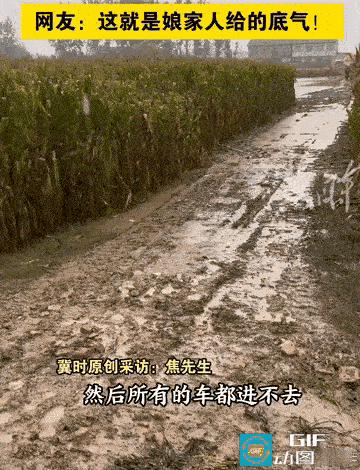 河南商丘,女孩出嫁当天大雨泥泞,让接亲的婚车根本靠近不了女方家。经过大家伙一顿商