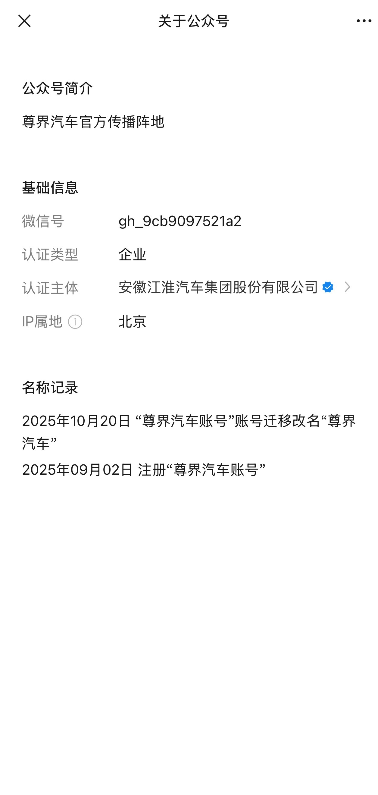 刚刷到了尊界汽车公众号迁移的消息,原来的主体是华为终端,现在彻底换成江淮汽车了,连账号ID都变了但名字没改,这波操作有点耐人寻味[doge]
