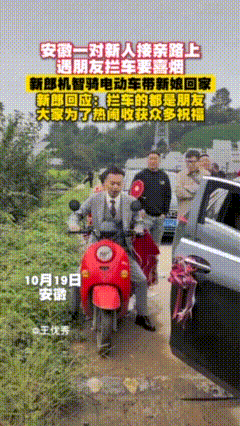 接亲被拦路要喜烟?新郎骑电动车带新娘溜了! 2025年10月19日,安徽广德一对新人在接亲回家的路上,遇到朋友拦车要喜烟。由于朋友众多,事先准备的喜烟不够分,加上眼看天气可能要下雨,而当时离家已经很近,新郎盛先生便灵机一动,带着新娘骑上路边一辆红色的电动车回家。 视频在社交平台上发布后,引发了网友的广泛关注和热议。有人质疑这是接亲路上被人狮子大开口,不给烟就不让走。对此,新郎盛先生在10月20日接受媒体采访时澄清,拦车是当地朋友表示看重的一种方式,并没有恶意,朋友们是凑热闹才拦车的。盛先生还希望网友们不要误会视频里拦车的朋友,也不要在网上对他们说不好听的话。 这对新人的独特经历不仅为他们自己留下了难忘的婚礼记忆,也让众多网友感受到了那份别样的热闹与祝福。