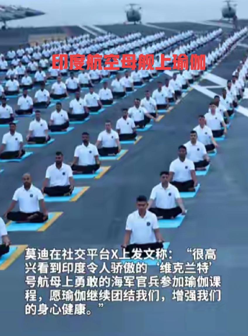 又一项世界纪录产生,航空母舰上练习瑜伽,试问还有谁能在航空母舰上做出这种声势?10月20日,印度总理莫迪到“维克兰特”号航空母舰上一起庆祝排灯节,官兵们在航母甲板上参加瑜伽课程,这下印度又打破一项世界纪录,可以好好吹一段时间了,因为印度什么都喜欢当第一,这次如愿以偿,坐在甲板上,后面停靠飞机,飘在海面,无人超越,祝贺印度又荣获一个第一,您怎么看?