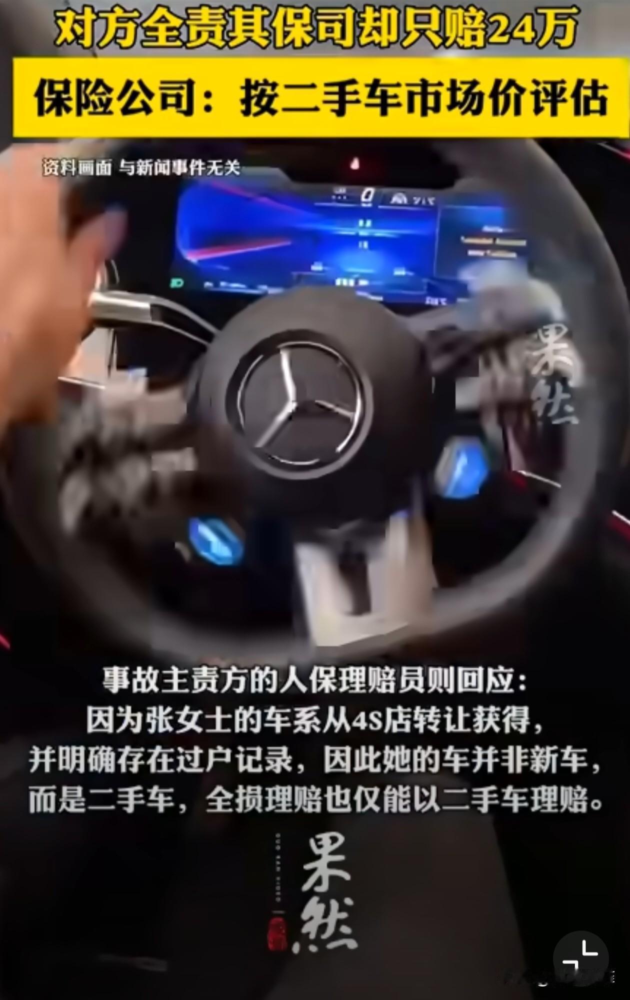 女子花67万买了辆奔驰,投保52万,发生事故严重追尾,几乎报废,对方全责,但对方保险公司只愿赔付24万。保险公司回应称:按二手车市场价评估。 湖北,女子在2023年花67万买了奔驰EQS系列中的一款试驾车,今年8月被人追尾,车撞得几乎报废,交警认定对方全责。 4S店初步预估维修费用53万,女子今年3月给车买的保险,保额是52万,但对方保险公司表示这车过户过,算二手车,现在市场价就24万,只肯按这个数赔。 女子觉得自己刚买的52万保险,才过5个月就只值24万,坚决不同意。 对方保险公司则认为二手车就该按现价算,24万是查的市场价,可以商量,但女子不接受。 女子自己的保险公司表示,能帮她找对方保险公司要,但多要的部分对方之后要是不承认,很难追回,建议女子要么起诉,要么找第三方评估车的价值。 有网友觉得女子太冤了,买保险时按高价算,赔钱时按低价给,换谁都接受不了,支持她争取更多赔偿。 也有网友吐槽保险公司,卖保险的时候不说清楚试驾车会按二手车价理赔,现在却用这个理由压价,有点欺负人。 女子可以和保险公司再好好协商,或者走法律途径来维护自己的权益。希望最后能有更公平合理的解决办法。