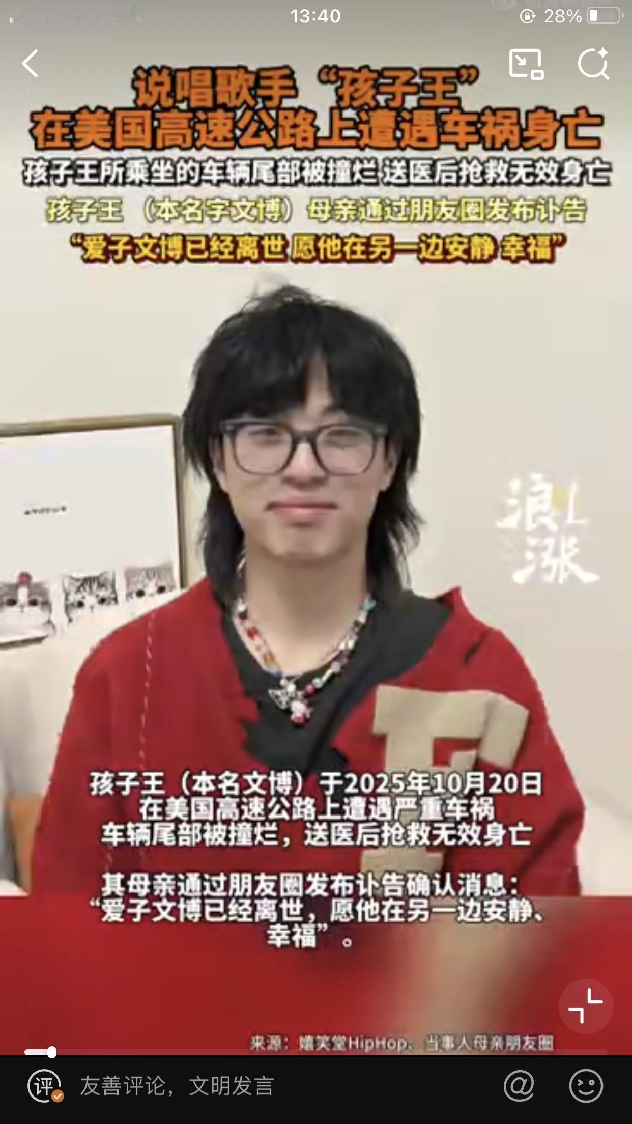 孩子王Jake在美国发生意外车祸离世!很多人可能不知道他是谁。他1997年出生于湖南娄底,是搞“抽象”文化的,在2024年的时候,Kanye(美国说唱歌手)的海口演唱会现场,他私自翻越围栏,强行冲上舞台,事后被拘了7天!因为这事引起了广泛的关注! 2025年他在一场Hip-Hop派对中,与路上发生冲突,被网友们称为节目效果变真实斗殴! 之后他又被爆拖欠房租4个月,曝光后他改了社交账号的名字“孩子王Jake(欠房租版)”! 网友们对他的评价其实是两极分化的,从2018年步入娱乐圈,参加过综艺(比如明日之子)也发过专辑,也做了很多荒诞是事情! 喜欢的人觉得,无论是他的歌还是做的事,虽然又无厘头、又夸张、又荒诞的,但是充满了能量,他是用这一切来对抗虚伪,活出了真实的自我! 不喜欢的人呢就觉得他是博眼球,所以在他身前也一直遭受着非议和网爆! 愿他在另一个世界继续做那个自由、鲜活的灵魂,没有了非议,没有了镜头追赶,只有他喜爱的音乐,喜爱的自由,一路走好!