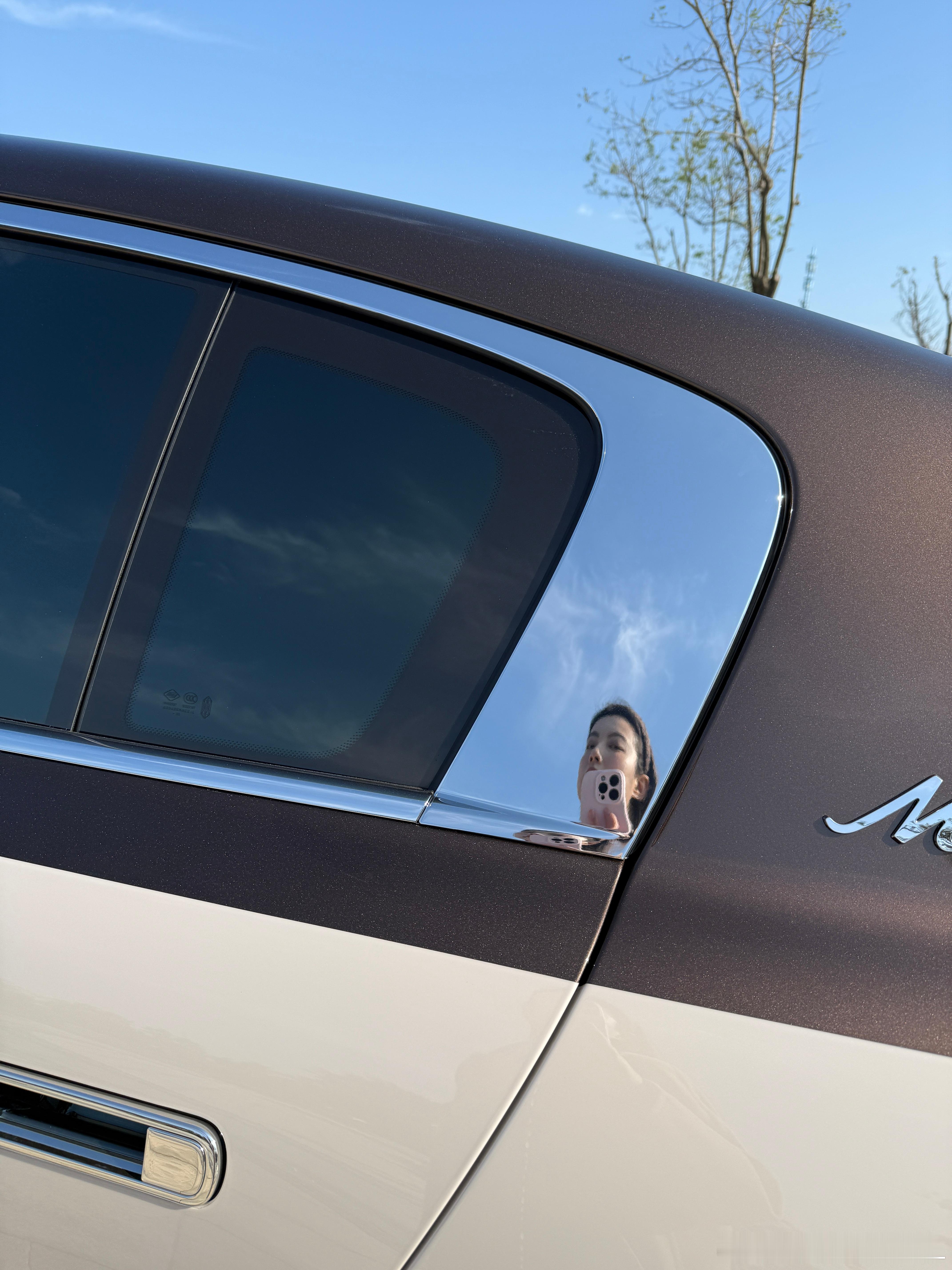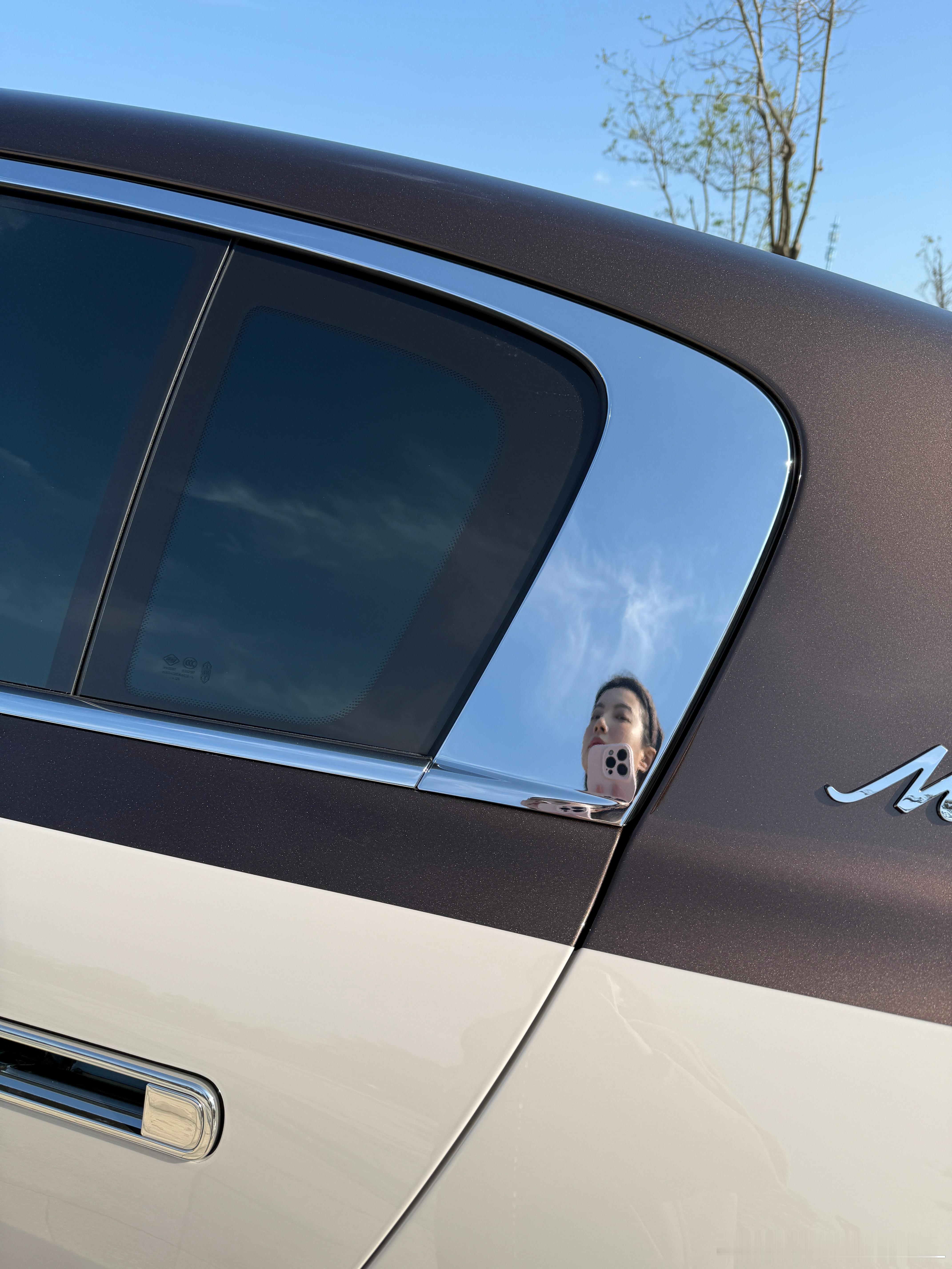 又解锁了尊界S800的一个功能,C柱的大镀铬亮的像镜子一样,可以让我瞬间变成猿气