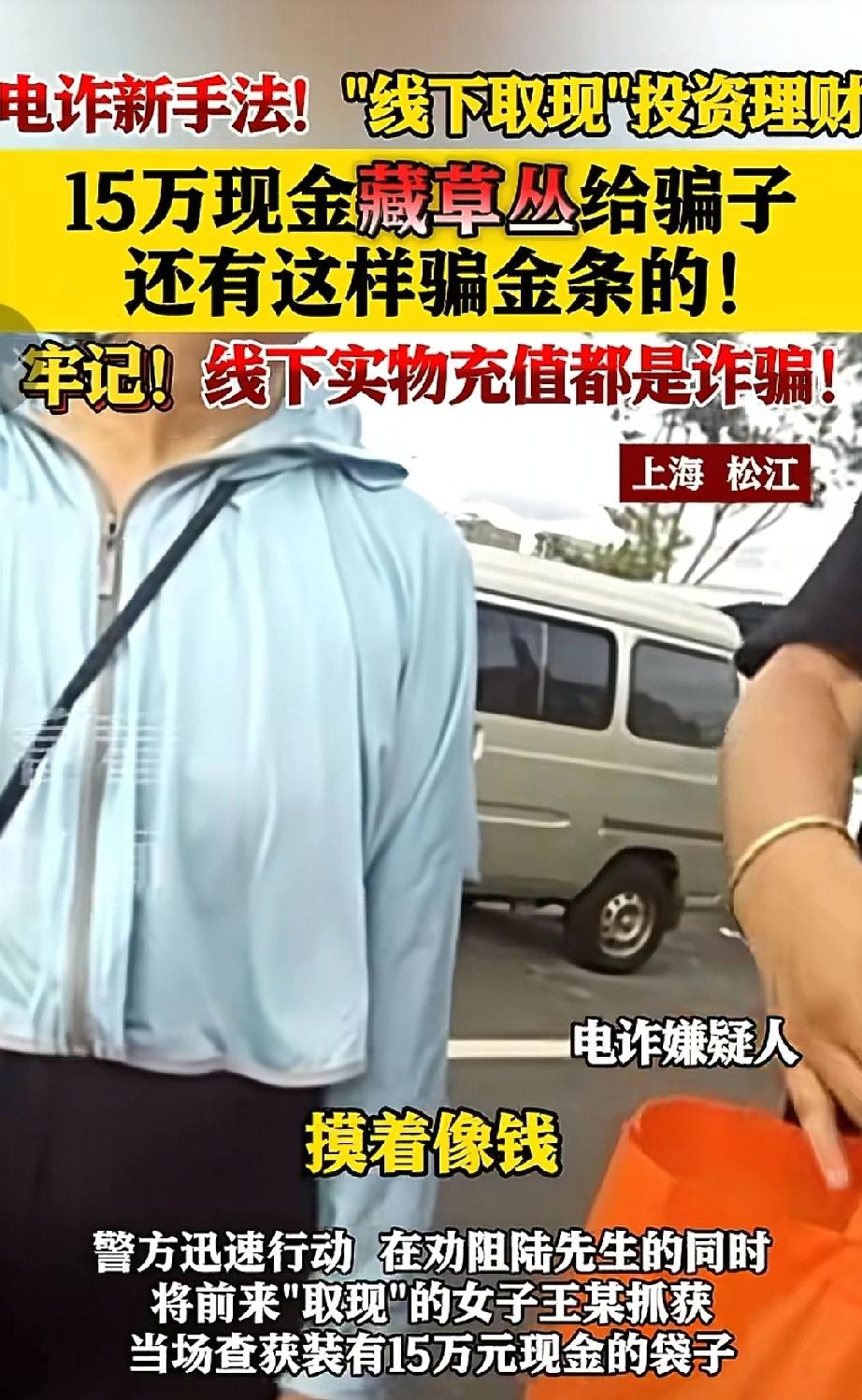 防不胜防,骗子的洗脑技术真达到了登峰造极!上海现电诈新套路,15万现金藏草丛、金条送上门,警方紧急拦截。 “你把钱藏到指定草丛,这是‘线下暗线操作’,避开监管更安全!” 当骗子抛出这套话术时,上海两位市民差点就把辛苦钱和贵重物品“送”进了诈骗陷阱。 近期,上海松江警方上演“反诈赛跑”,成功拦截两起新型“线下取现”投资理财诈骗,一口气挽回及避免近45万元损失,而骗子的套路,刷新了不少人的认知。 据警方通报,这两起诈骗的手法如出一辙:骗子先通过社交平台添加受害者,以“高回报投资理财”为诱饵,用虚假的盈利截图和“内部渠道”的说辞获取信任。 等受害者心动想要投入资金时,骗子话锋一转,不再要求线上转账,而是提出“线下实物充值”的“新玩法”。 其中一位受害者被诱导将15万元现金,按照骗子的指令藏到了指定的草丛里,就等着“资金到账开始盈利”;另一位受害者则被忽悠着带上家中的金条,准备送到骗子指定的地点,以为这样就能“搭上高收益的快车”。 万幸的是,松江警方通过反诈预警系统及时发现异常,第一时间联系受害者并上门劝阻。 面对民警的耐心解释,两位受害人才幡然醒悟——所谓的“线下操作避监管”,根本就是骗子为了绕过线上资金追踪、快速转移实物资产的骗局!一旦现金和金条被骗子取走,想要追回难如登天。 大家一定要警惕所有要求“线下实物充值”的投资理财,100%是诈骗! 不管骗子把“线下操作”吹得多安全、多隐蔽,本质都是为了切断资金流向的追踪线索,让受害者的钱和物彻底脱离掌控。 别被“高回报”冲昏头脑,更别信“线下暗操作”的鬼话。你辛辛苦苦攒下的现金、金条,在骗子眼里只是待收割的“韭菜”。遇到任何要求线下交付财物的“投资”,第一时间拨打110,或者联系社区民警核实,才是保护财产安全的正确做法! 扩散提醒身边人,别让骗子的“洗脑套路”再得逞! 反诈骗,懂防范