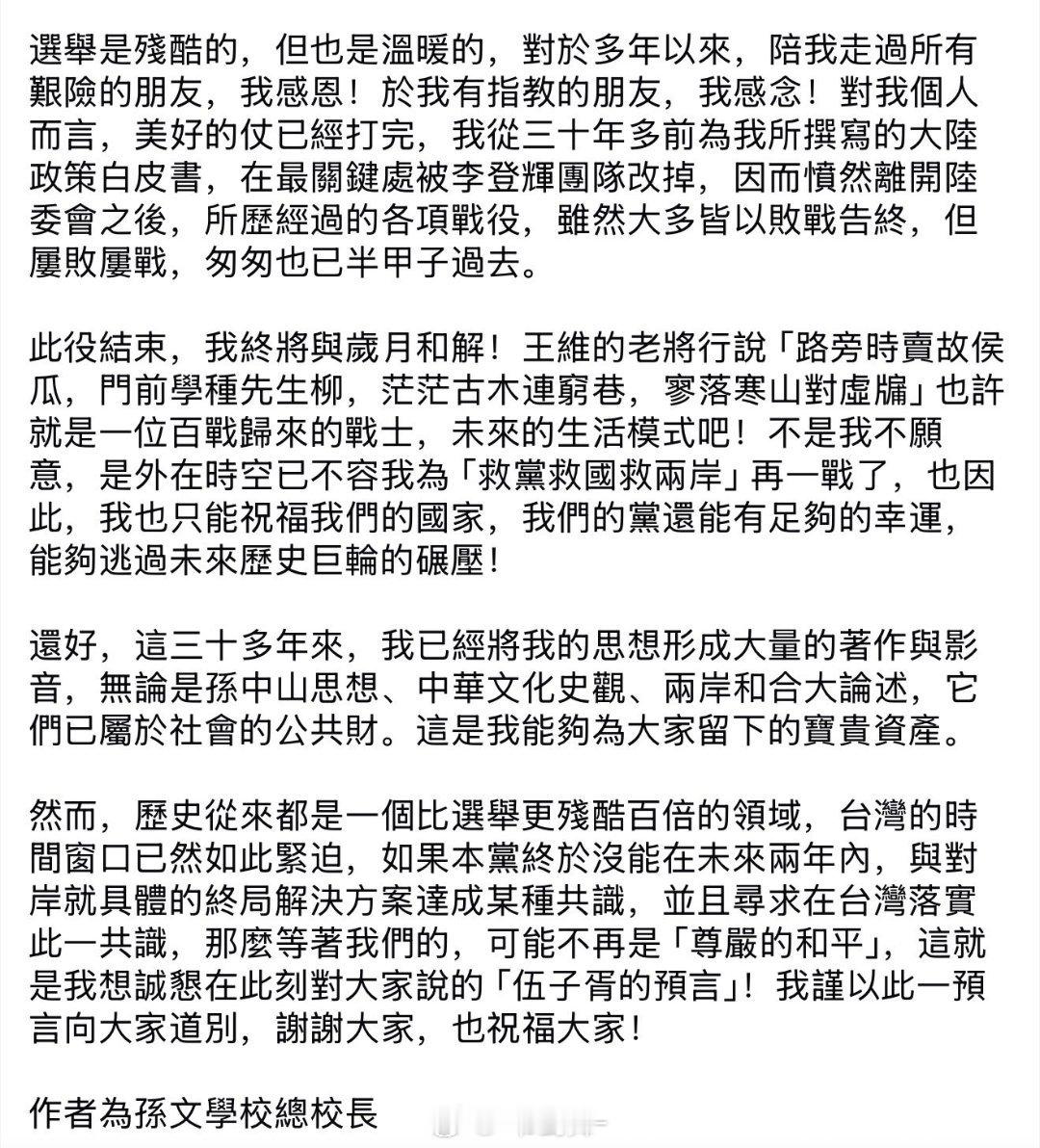 选举惨败后他发了截图中这篇文章,他的文笔在揽镜自顾与回眸历史苍穹间徘徊切换,让我阅读时播放起中国古曲《江天晓》文中他引用『杨万里、宋诗、杜甫、王维』不断借古人之语表达当下的历史感与悲剧意识。