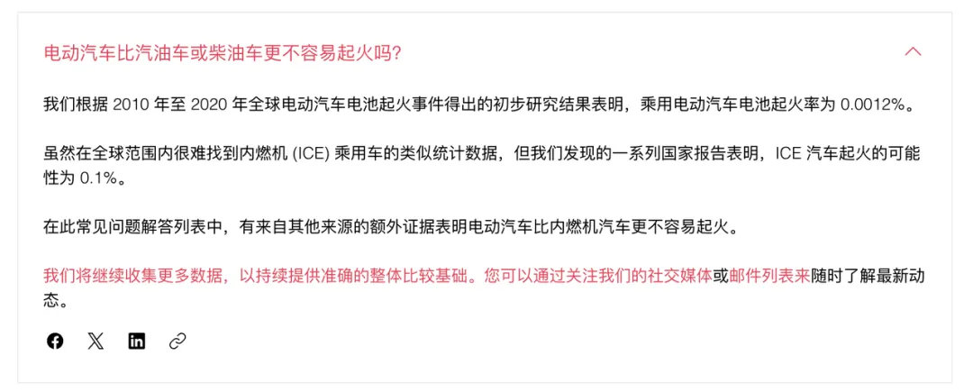澳大利亚EV FireSafe的研究同样指出,电动车的起火概率(0.0012%)显著低于燃油车(0.1%)。能源与气候情报机构的科林·沃克总结道:“所有数据都表明,电动车起火的可能性比燃油车低得多。”
