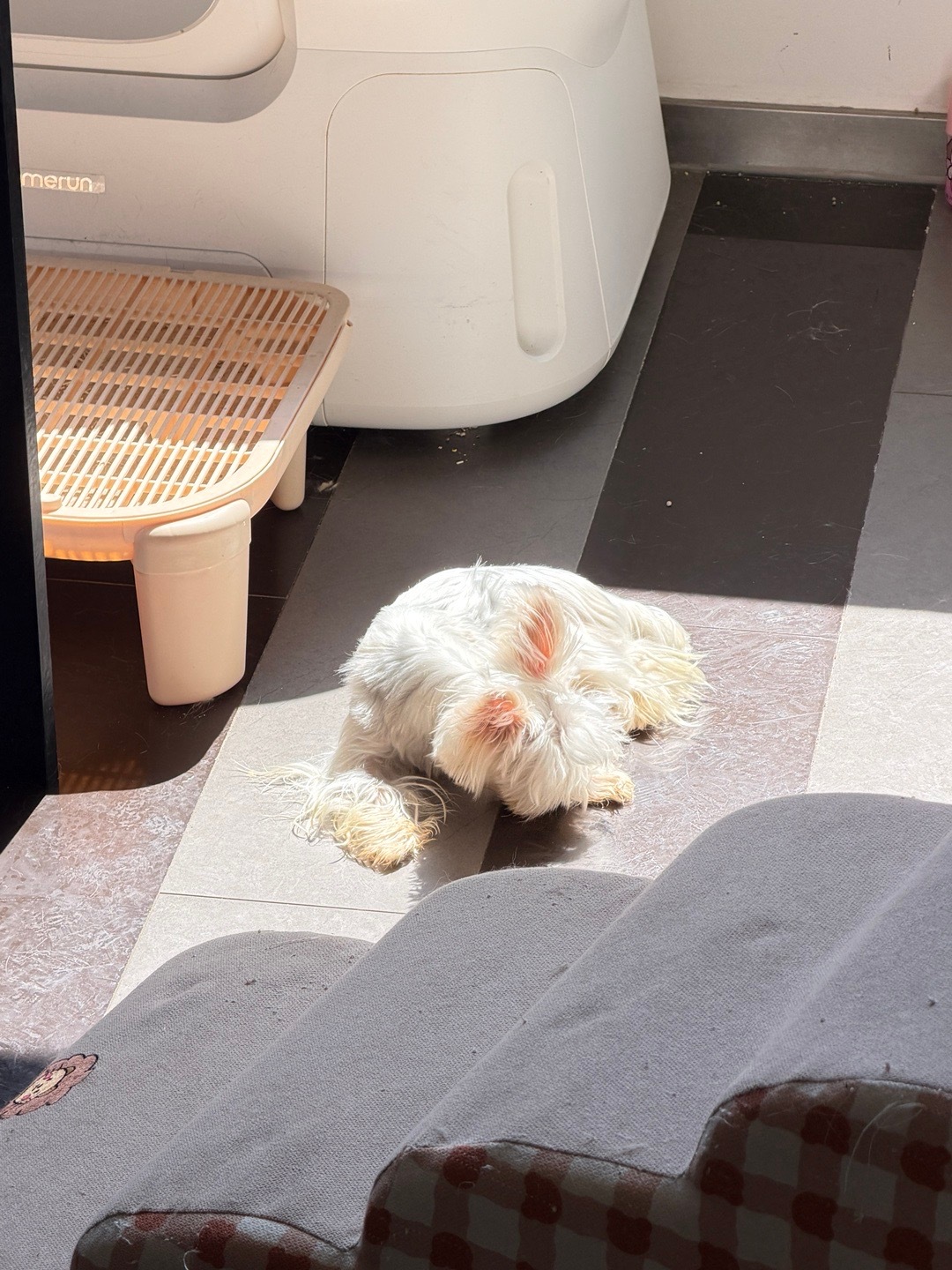 早上好[你好]坚持早起的第一天 已经吃完午饭准备去工作了 效率拉满 今天难得好天气出太阳 小扎扎自觉得跑去晒背哈哈哈