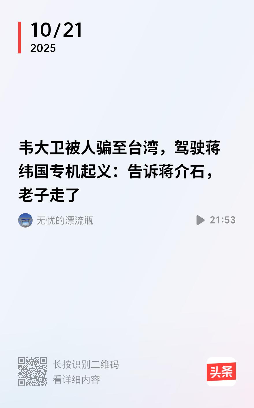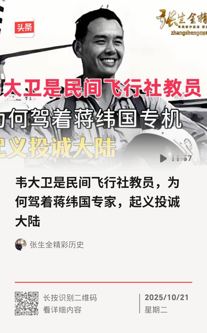 17岁被拐台湾,他偷蒋纬国专机喊"老子走了"冲回大陆!这操作太疯魔 1956年1月7日,台北松山机场上空突然响起一阵急促的引擎轰鸣声。一架本该停在停机坪的蒋纬国专机,竟在无人调度的情况下直冲云霄。塔台紧急呼叫,无线电里传来一个年轻人的怒吼:"我是韦大卫,你告诉蒋介石,老子走了!"这个17岁被拐卖到台湾的少年,用一场近乎疯狂的"劫机",完成了跨越海峡的归途。 1949年的夏天,17岁的韦大卫还是个对未来充满憧憬的热血小子。街头一则"军校招生,保送美国深造"的广告,让他动了心。收拾行囊报名,登上轮船的那一刻,他以为自己抓住了改变命运的机会。船行至半途,他才发现不对劲,同行的人哭天抢地,原来这根本不是什么军校招生,是"卖猪仔"——他们全被拐去台湾当兵。 轮船靠岸,韦大卫和其他人被直接拉进凤山军营。这里就是个牢笼,枪毙逃兵是常有的事,新兵稍有不从就是一顿毒打。别人都在默默忍受,韦大卫却攥紧了拳头,在心里发誓:"你怎么弄我,我就怎么对付你,总有一天要逃出去。" 1950年双十节当晚,暴雨倾盆,营区的守卫比平时松懈了些。韦大卫瞅准机会,拉上两个志同道合的战友,趁着夜色溜出营房。三人先是跳进附近的河里游了一段,上岸后在烂泥地里手脚并用地爬,身上被树枝划得全是伤口,不敢发出一点声音。好不容易逃出军营,两个战友却打了退堂鼓,说韦大卫是主谋,目标太大,跟着他迟早被抓,扔下他独自跑了。 韦大卫没抱怨,一个人继续逃。白天躲在野地里,饿了就挖野菜、摘野果,晚上借着月光赶路。鞋子磨破了,就光着脚走,脚底全是血泡。就这么硬扛了20多天,他终于逃到了屏东。 到了屏东,韦大卫琢磨着怎么回大陆。他觉得水路靠谱,就去考海军士官学校。凭着一股狠劲,还真考上了。可上了军舰他才傻眼,这破船只在台湾周边海域巡逻,根本不可能靠近大陆。水路走不通,他又把主意打到了天上——考空军军官学校。没想到,他又考上了。眼看就能摸到飞机操纵杆,可因为拒绝加入国民党,他被安上"共产党嫌疑"的罪名,关了三个月。 出狱后,韦大卫没放弃。他跑到美军基地当割草工,每天起早贪黑,还趁着工作间隙捡些可回收的垃圾去卖。攒下的钱,他一分没乱花,全用来打点关系,终于进了台北飞行社。他学东西快,驾驶技术过硬,为人又活络,没多久就成了松山机场的"红人",能接触到各种飞机。 这时,他盯上了停在机场的蒋纬国专机。他趁着工作便利,偷偷配了钥匙,每天下班回到住处,就对着画好的飞机图纸琢磨起飞路线和操作细节。1956年1月7日,他觉得时机成熟了。找了个借口让警卫把专机推到跑道上,假装要进行例行检查。钻进驾驶舱,插入钥匙扭动,没想到钥匙居然被拧弯了。他心一横,赶紧下飞机找了个锤子,把钥匙敲平,又冲回驾驶舱点火启动。 引擎启动的声音惊动了警卫,可不等他们冲过来,韦大卫已经拉起操纵杆,飞机直冲蓝天。台湾空军紧急派出四架F-86战斗机拦截,可韦大卫把飞机开得像疯了一样,不断变换航向,硬是甩开了追兵。 飞到福州上空时,大陆的高射炮部队发现了这架不明国籍的飞机,炮弹在飞机周围炸开,机舱里的仪表盘都在震动。韦大卫急得满头大汗,一边操控飞机躲避炮火,一边拼命摆动机翼,示意自己没有恶意。时任福建军区司令的叶飞,在地面观察到飞机的异常动作,觉得不对劲,下令:"如果飞机继续往内陆飞,停止炮击。" 韦大卫抓住机会,驾驶飞机朝着陆地俯冲,最终在一片空地上紧急迫降。飞机停下的那一刻,他瘫在座椅上,眼泪顺着脸颊往下流——他终于回来了。 后来的岁月里,韦大卫的人生依旧充满波折。特殊年代,他被关进丰台监狱,却成了那里唯一成功越狱的人。有人问他,当初偷专机的时候不怕死吗?他笑着说:"我觉得应该可以,我就干。" 韦大卫的故事,透着一股不管不顾的疯劲。那种在绝境里绝不低头的倔强,那种为了回家不惜一切的执念,让人看得热血沸腾。这哪是简单的"逃兵",是个敢和命运死磕的硬骨头。蒋介石传 蒋蒋支招