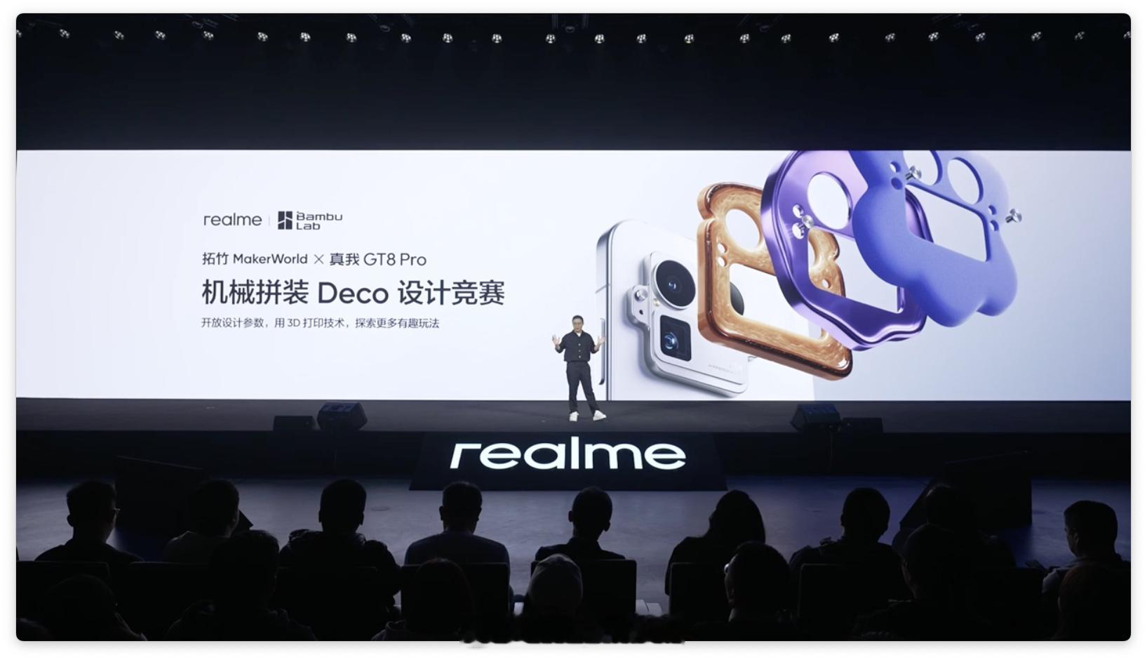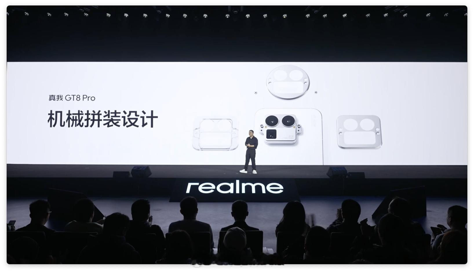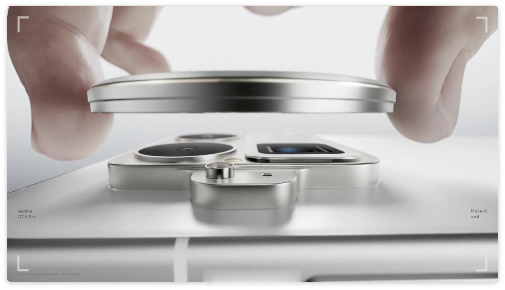 这次再 GT8 Pro 上,真我更是玩了一把「大的」。直接使用「拼装」的思路,来重新设计了一个可以自行拆卸更换安装的相机 Deco——机械拼装设计。