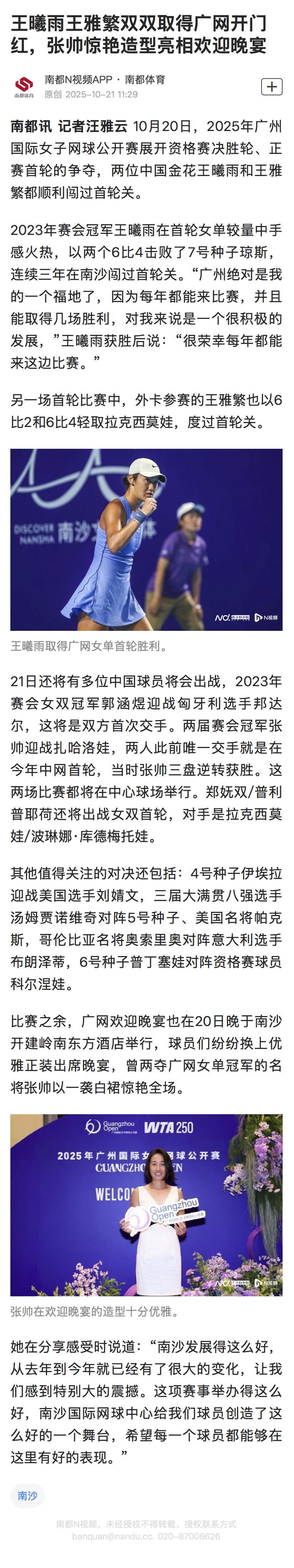#王曦雨王雅繁广网开门红#【王曦雨王雅繁双双取得广网开门红,张帅惊艳造型亮相欢迎晚宴】#王曦雨称广州是福地#10月20日,2025年广州国际女子网球公开赛展开资格赛决胜轮、正赛首轮的争夺,两位中国金花王曦雨和王雅繁都顺利闯过首轮关。