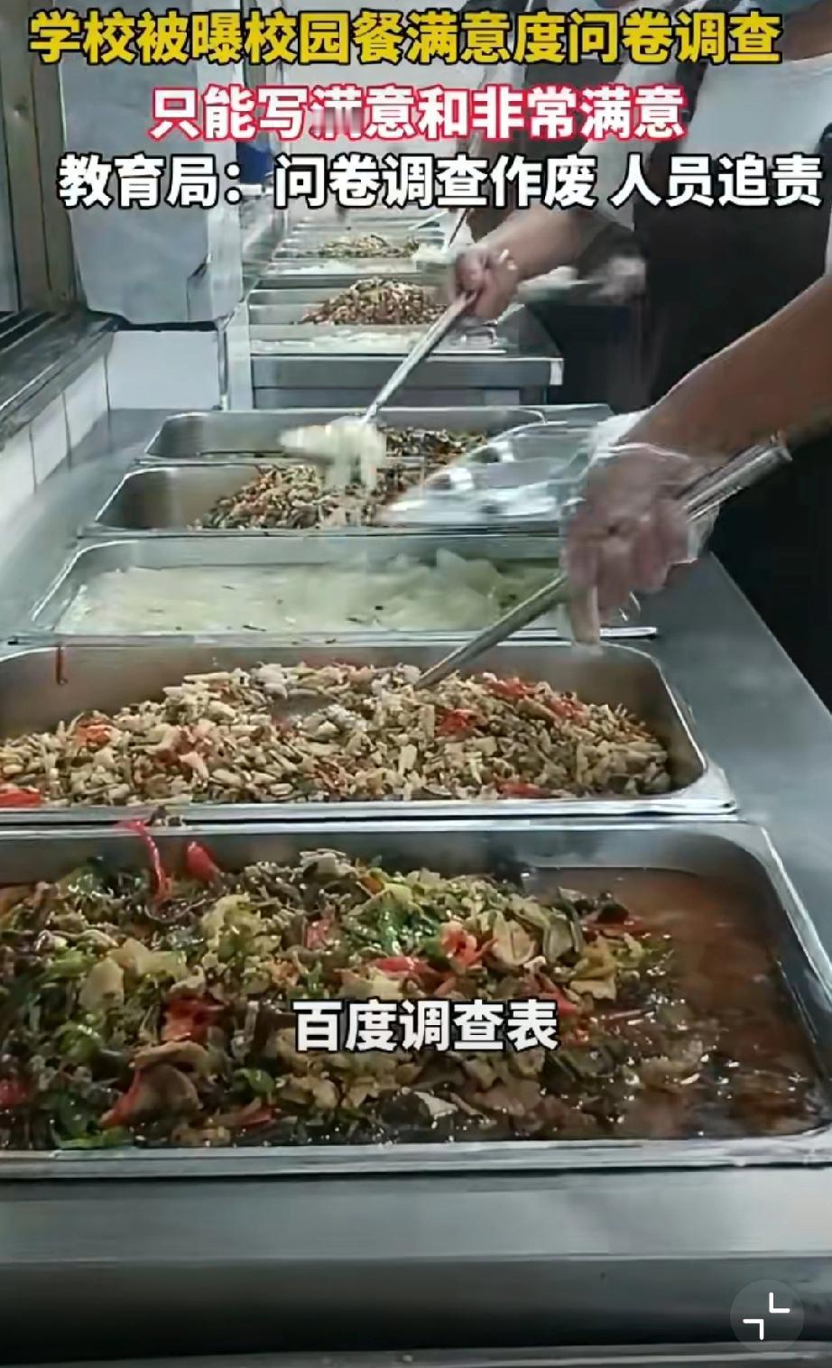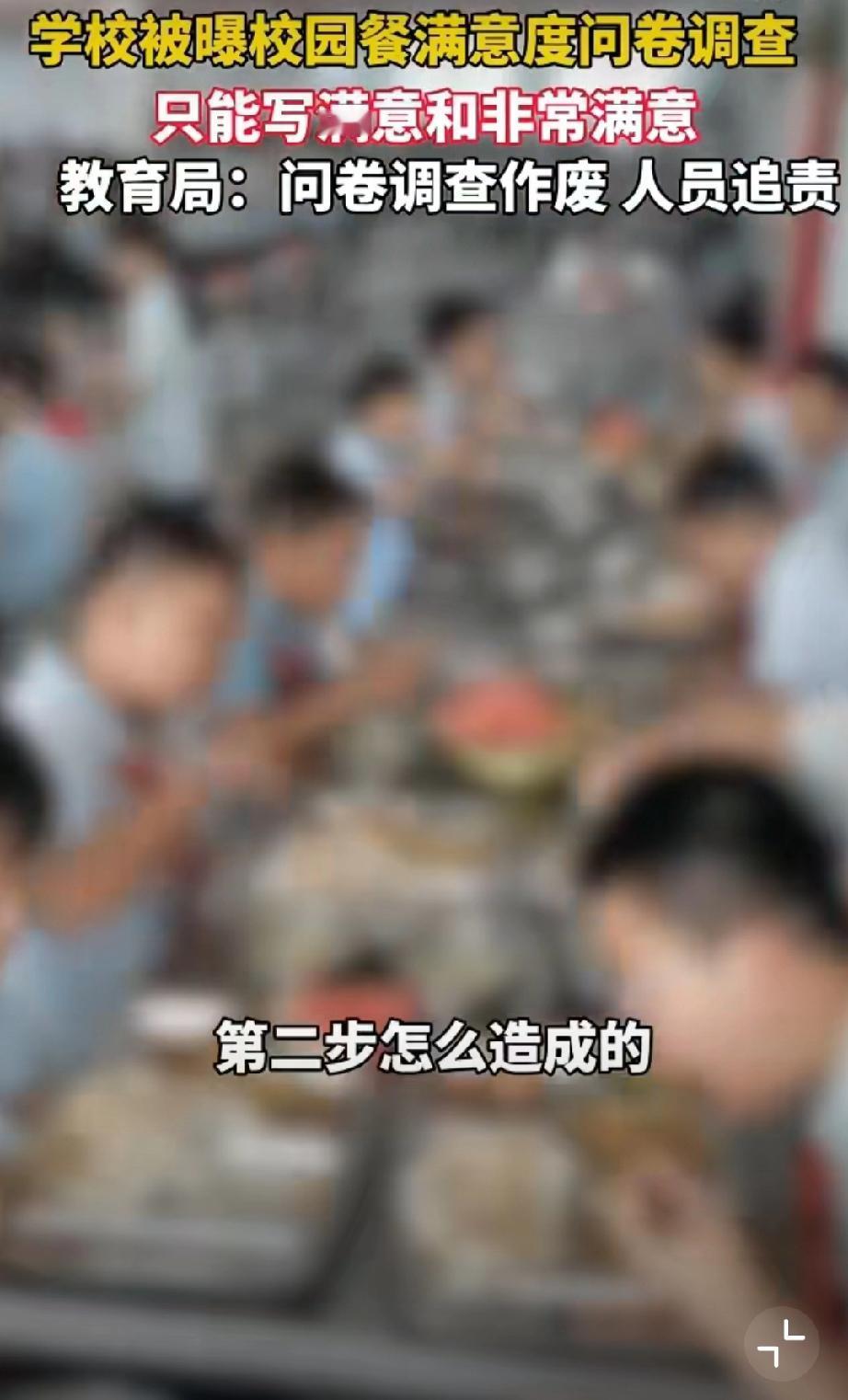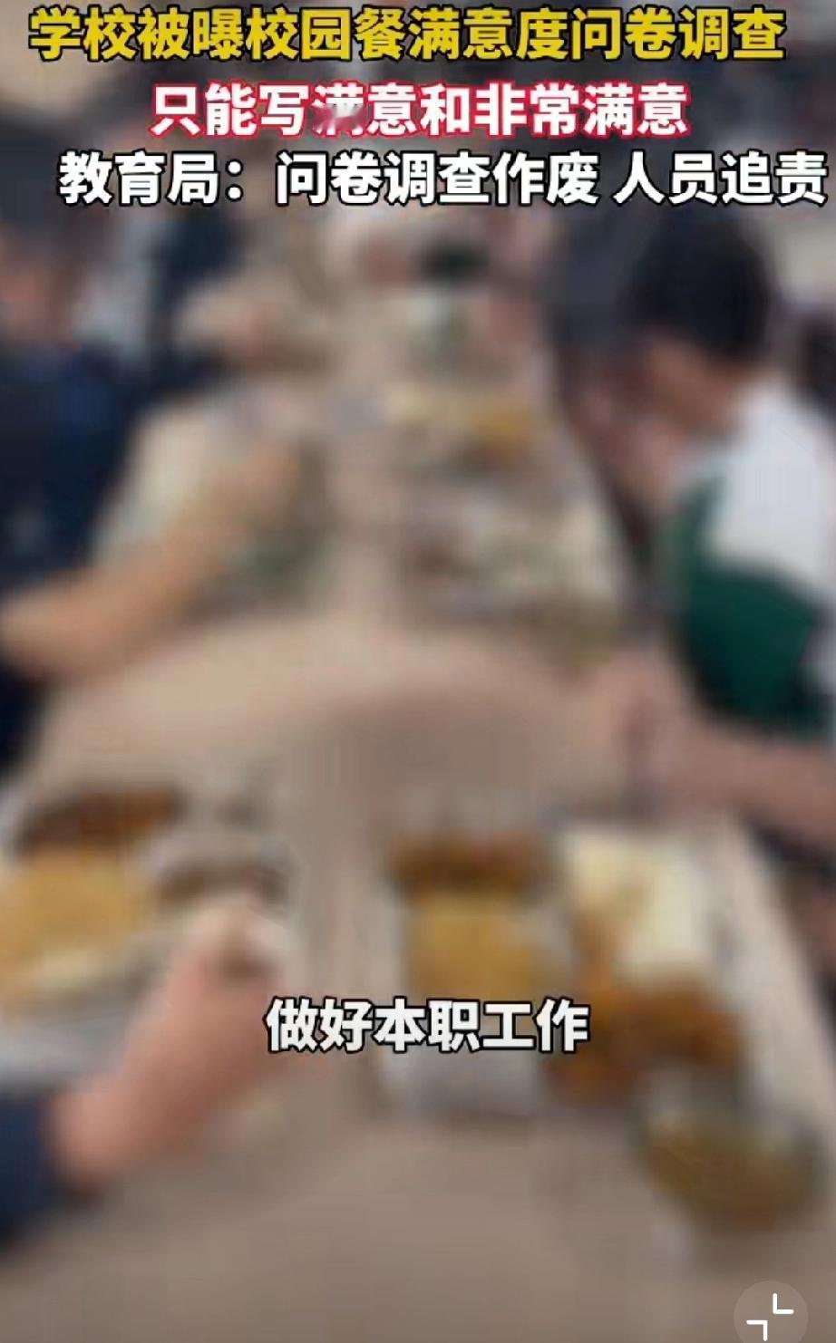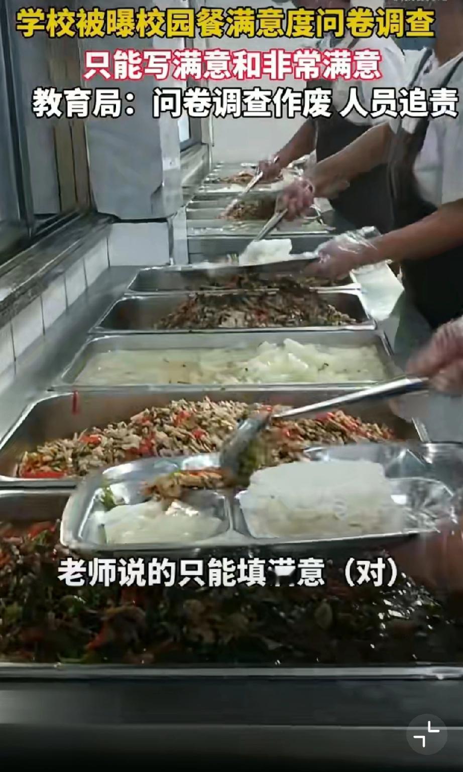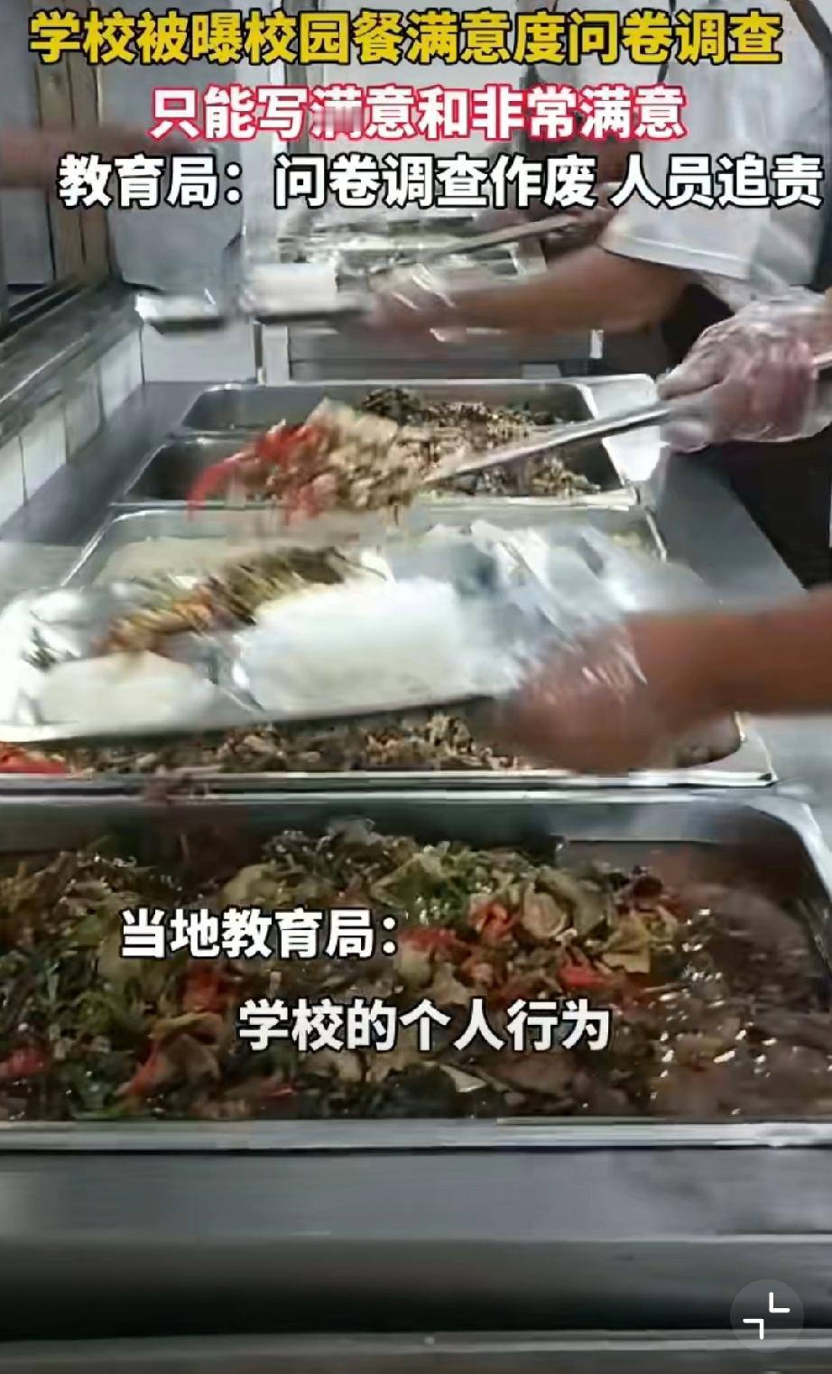学校被曝校园餐满意度问卷调查,只能写满意和非常满意。教育局:学校个人行为问卷作废。问题来了:既然与教育局格式不一样交上去也没用,那么学校还要这么干是为什么呢?由此笔者怀疑:学校领导与食堂承包商之间的关系值得调查,既然好评如潮那自然可以续签嘛。