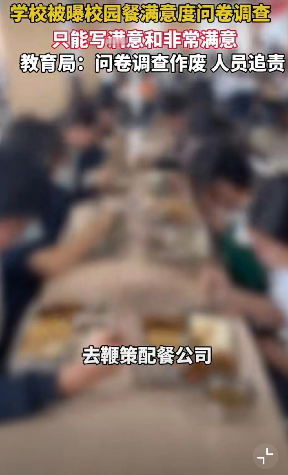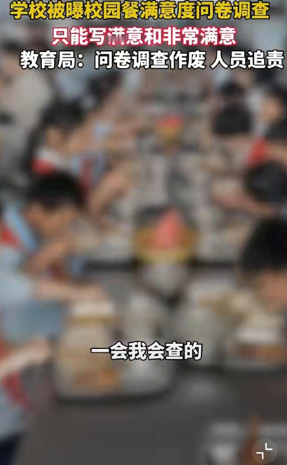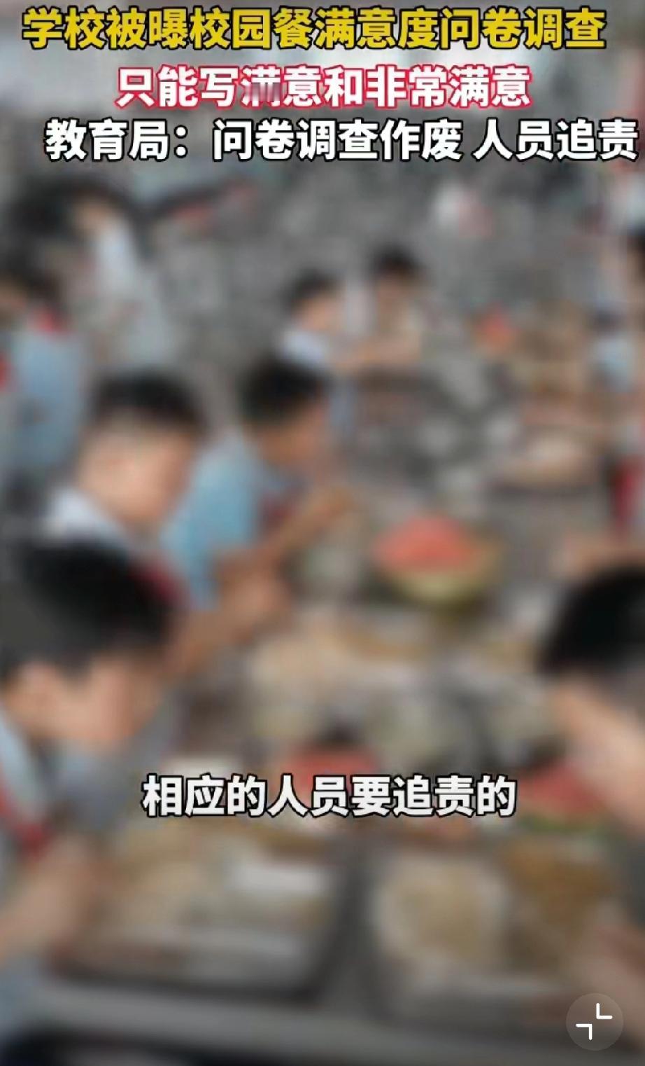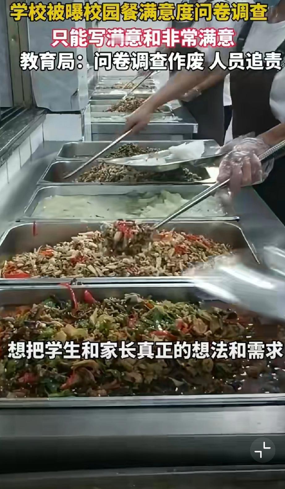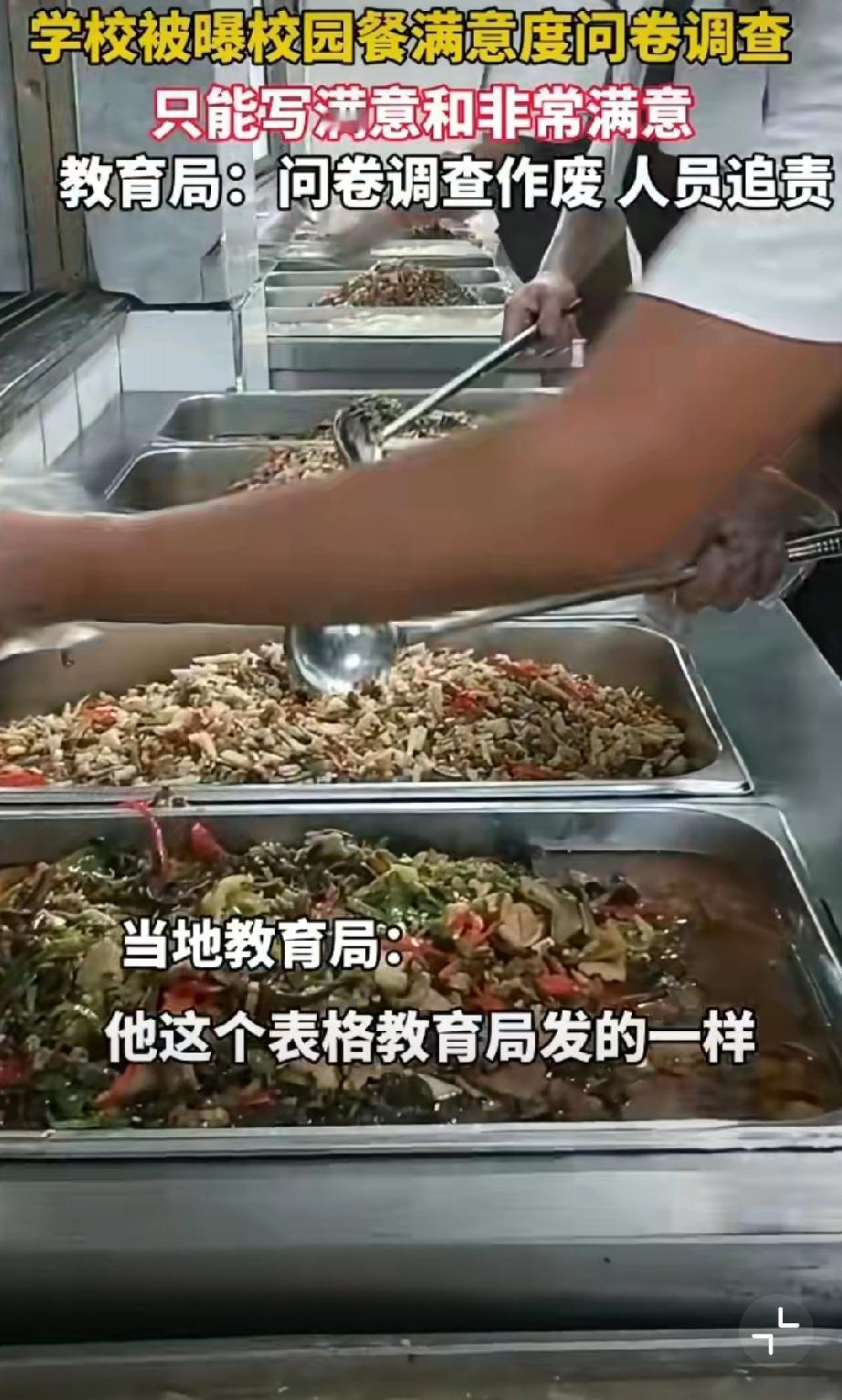 学校被曝校园餐满意度问卷调查,只能写满意和非常满意。教育局:学校个人行为问卷作废。问题来了:既然与教育局格式不一样交上去也没用,那么学校还要这么干是为什么呢?由此笔者怀疑:学校领导与食堂承包商之间的关系值得调查,既然好评如潮那自然可以续签嘛。