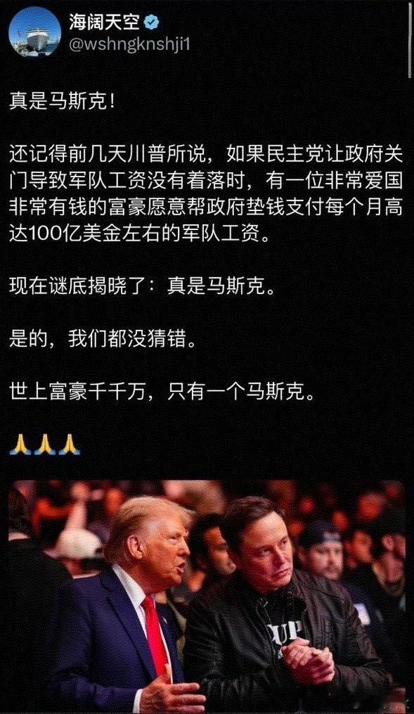 这个特朗普粉丝也是急眼了,说特朗普口中那个,愿意为美国军队垫付工资的亿万富豪就是马斯克。
