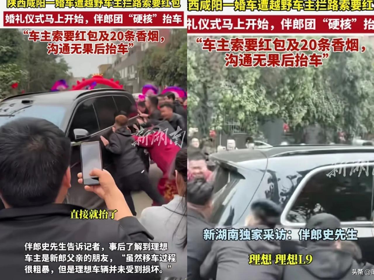 不能惯着! 陕西咸阳伴郎团抬车这波操作,简直大快人心! 结婚本是天大的喜事,结果一辆越野车横在路中间,张口就要红包加20条中华,算下来近万元的开销,这哪是讨喜,分明是借着习俗敲竹杠。 更讽刺的是,事后才知拦车的竟是新郎父亲的朋友,真是大水冲了龙王庙。传统里拦婚车是图个热闹,塞包糖、给个小红包就够了,现在倒好,成了某些人敛财的由头,甚至涉嫌违法。 伴郎团直接上手抬车,抬走的是挡路车,更是抬出了对陋习的硬气态度。习俗的核心是情分,不是利益,把祝福变成交易,再熟的关系也变了味。 你们那儿拦婚车有啥规矩?遇到这种过分的,是该妥协还是硬刚?