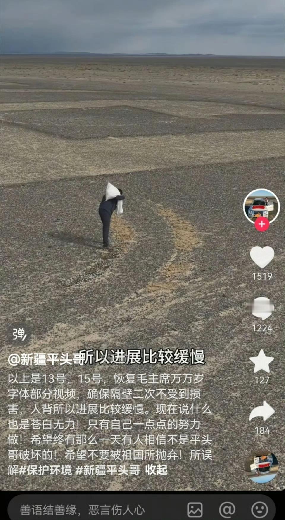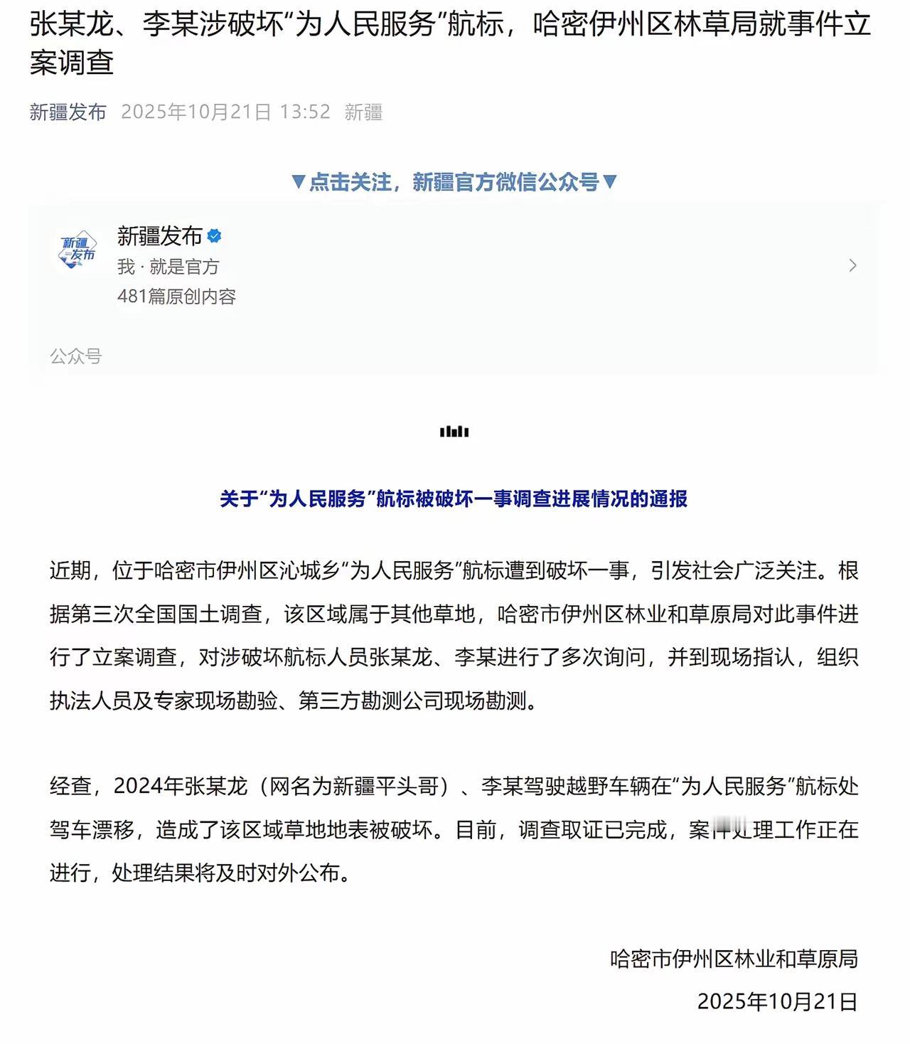 大快人心! 抓了,就是他俩。 一个姓张,一个姓李。 新疆哈密市伊州区林业和草原局发布通报:证实沁城乡‘为人民服务’航标遭破坏一案,已完成调查。(图一:修复前后对比图) 经查明2024年张某龙(网名新疆平头哥)、李某驾驶越野车在该处漂移,破坏草地。(图二) 看了博主二狗的修复视频,一共花了20吨石头,用了好几天的时间,左边是“人”,右边是“民”,他们就非得在人民中间搞破坏,为了流量博眼球,真是什么事都做得出来! 此前还在极力否认(图三),现在官方通告来了,已被立案调查,这也再次给那些为了流量毫无底线的“网红”敲响了警钟。 官方通报2人破坏为人民服务航标