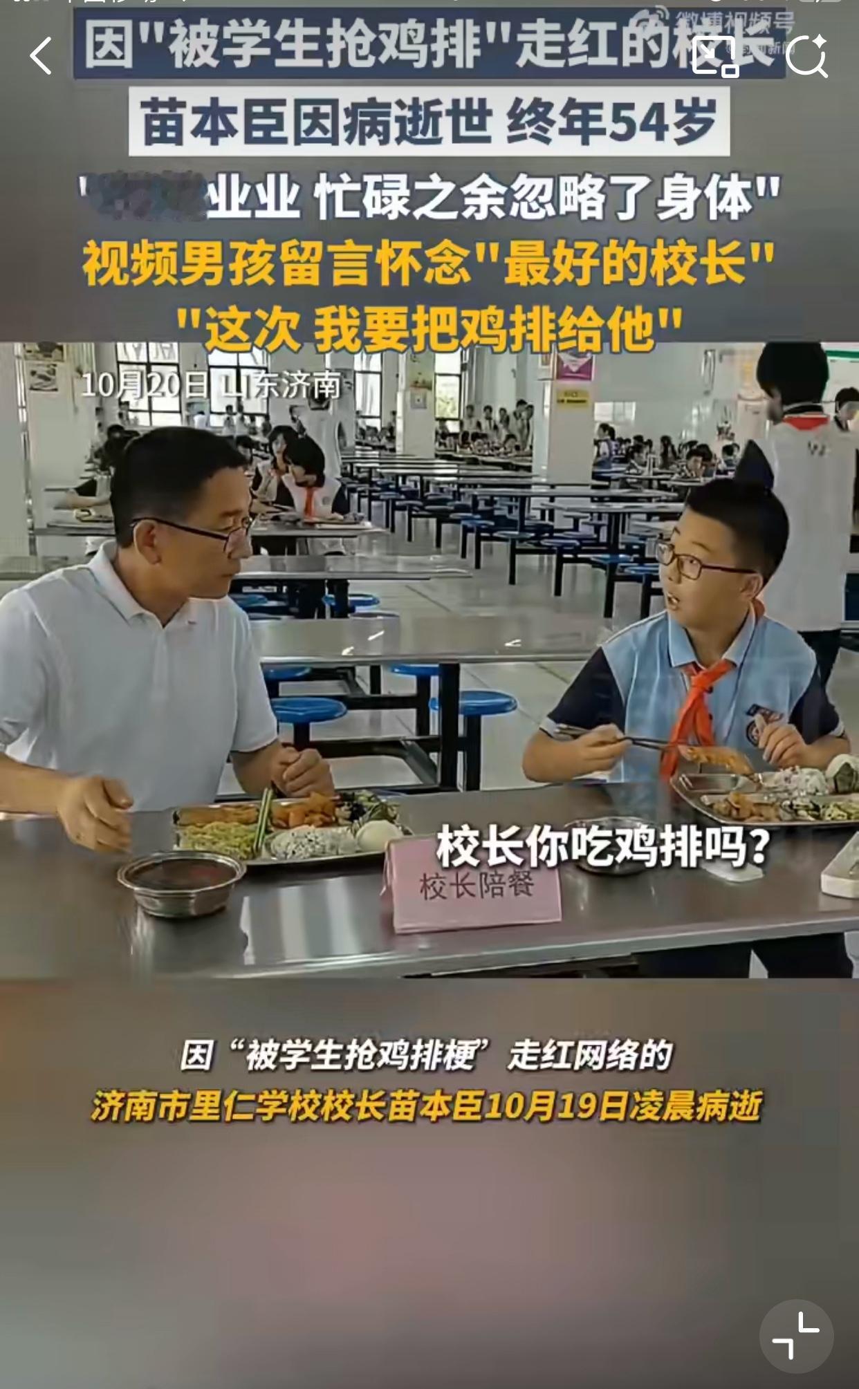三年前校长被学生“抢”鸡排! 三年后这位校长操劳过度,因病逝世! 看了这校长的过往,真的非常了不起!苗本臣校长是济南里仁学校的校长,他推出了少年君子教育,比如爱劳动、讲礼仪的孩子都能获得奖章表扬,不仅仅是学习,而是让每个孩子都能够找到属于自己的闪光点!还给孩子们开展了52门选修课,游泳、机器人、足球等等啥都有,还带出了全国冠军足球队! 不仅如此,每天都会早早的就到学校迎接学生的到来,会陪学生吃饭,还会关注每一个孩子的健康! 他的突然离世,学生们自发悼念,家长们惋惜“以后早晨再也见不到他在校门口迎接孩子了,我们失去了一位能够倾听的朋友了”,网友们也纷纷刷屏,再也见不到抢鸡排的校长了! 他以仁爱之心践行教育本质,为师生们打造了一个充满温度的成长环境,这样的一位好校长却早早离开,您辛苦了,一路走好!