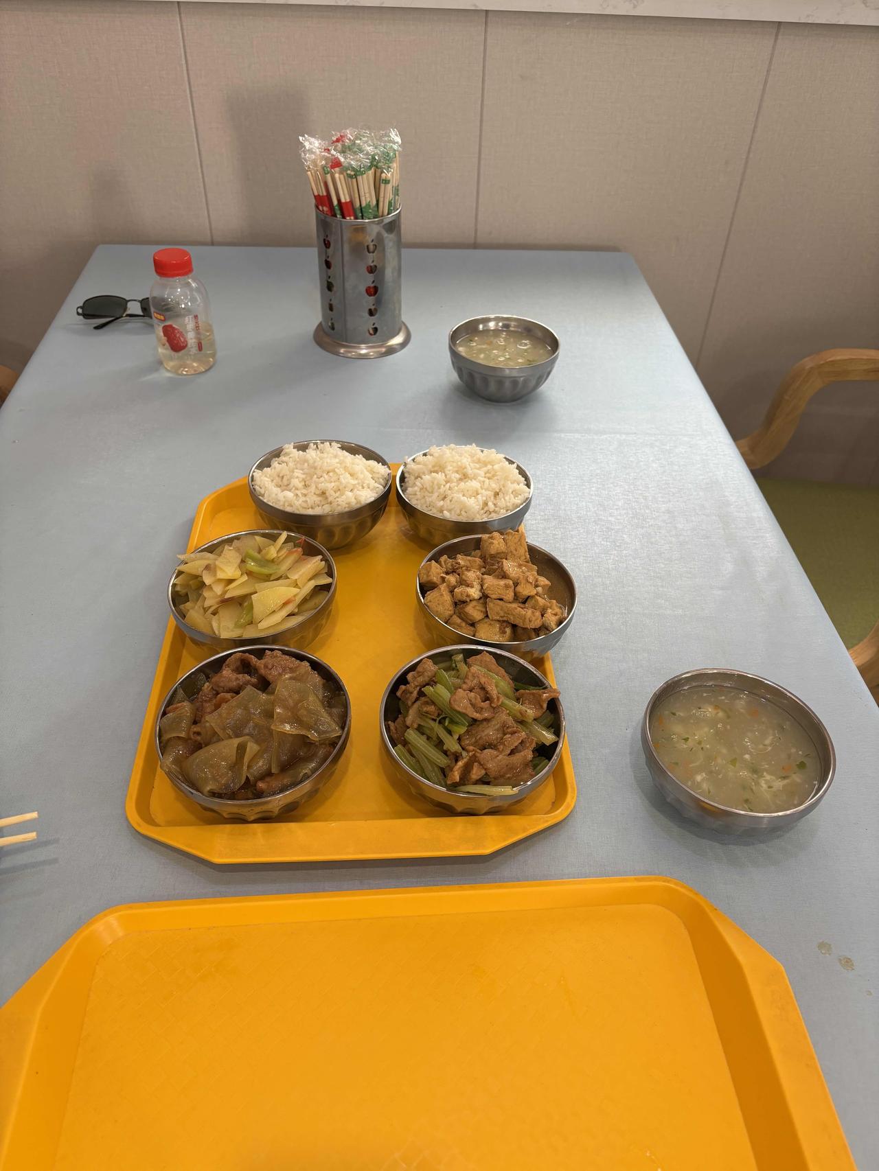社区幸福食堂,一顿暖心的家常饭 三个人,两荤两素四个菜,配上米饭,再喝上碗免费