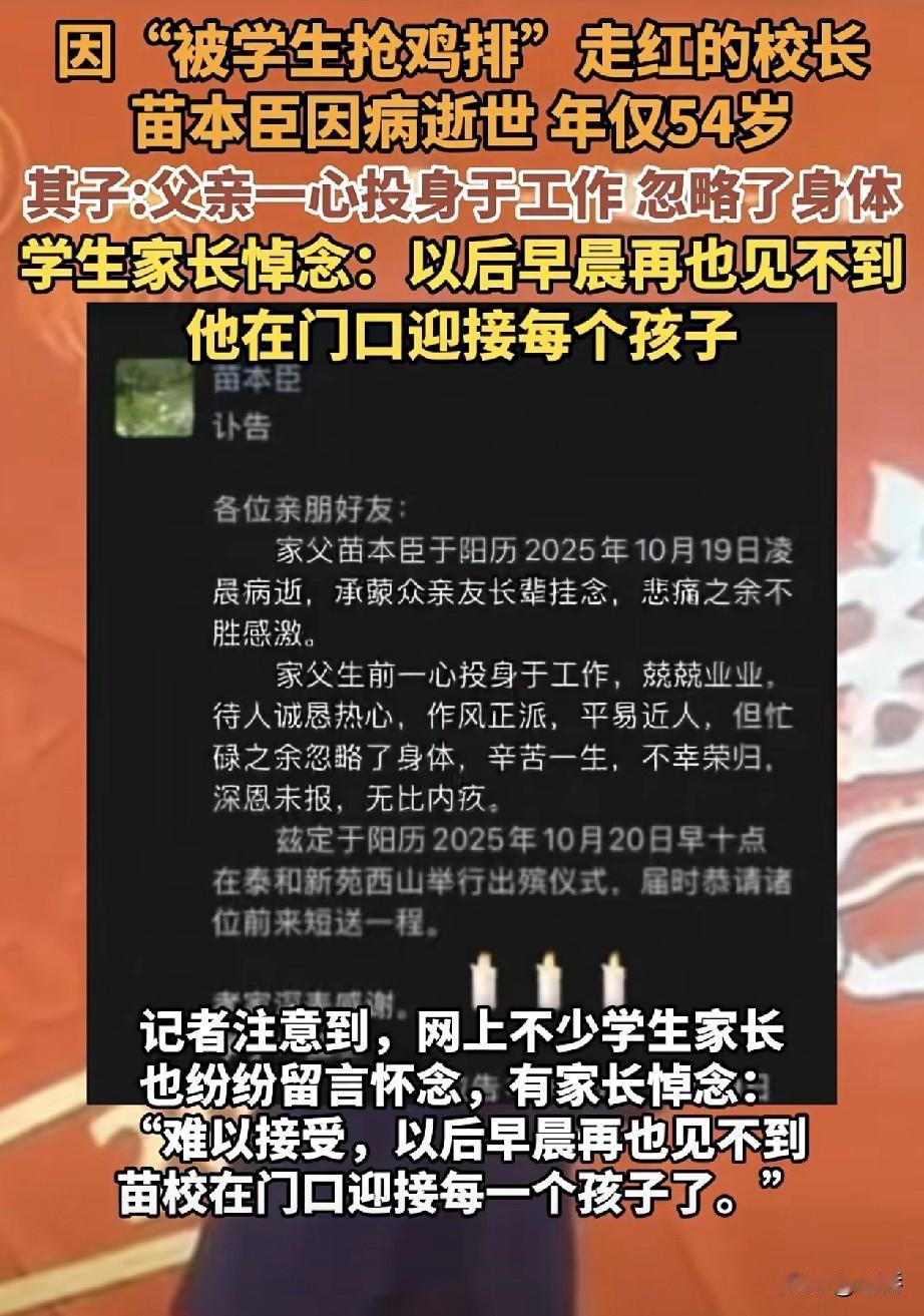 很遗憾以这种方式认识你!因“被学生抢鸡排”走红的济南市里仁学校校长苗本臣因病逝世,年仅54岁。据其儿子介绍,他一心投身于工作,忽略了身体。 记得上一次是因为鸡排认识的苗校长,没想到这一次,却看他因病逝世了。而孩子竟然敢明目张胆的抢校长的鸡排,可见他平时有多和蔼可亲,平易近人,他是一个非常好的校领导,也能和孩子打成一片,是实实在在的教书育人。 不少家长都说,每天在校门口都能看见苗校长接送孩子。 有网友说,孩子说以后吃不到苗校长兜里的糖了,苗校长口袋里会经常装一些糖分给学生。 刷到这样一位好校长离世的消息,瞬间红了眼。这么年轻,这么为孩子着想的校长,没想到就这么走了,愿天堂没有病痛,一路走好。[祈祷][祈祷][祈祷]