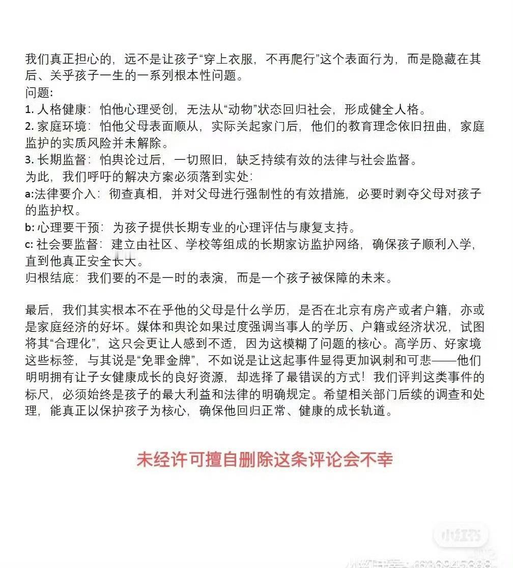 为什么后续没了啊!今天热度也没了啊! 我们想看到的后续,是官方机构接管小孩, 给安排身体检查,认知引导,心理治疗。 想看到他学会用勺子吃饭,穿干净的衣服, 站起来走路,开开心心的上学生活。 跟普通孩子一样的普通快乐的童年。