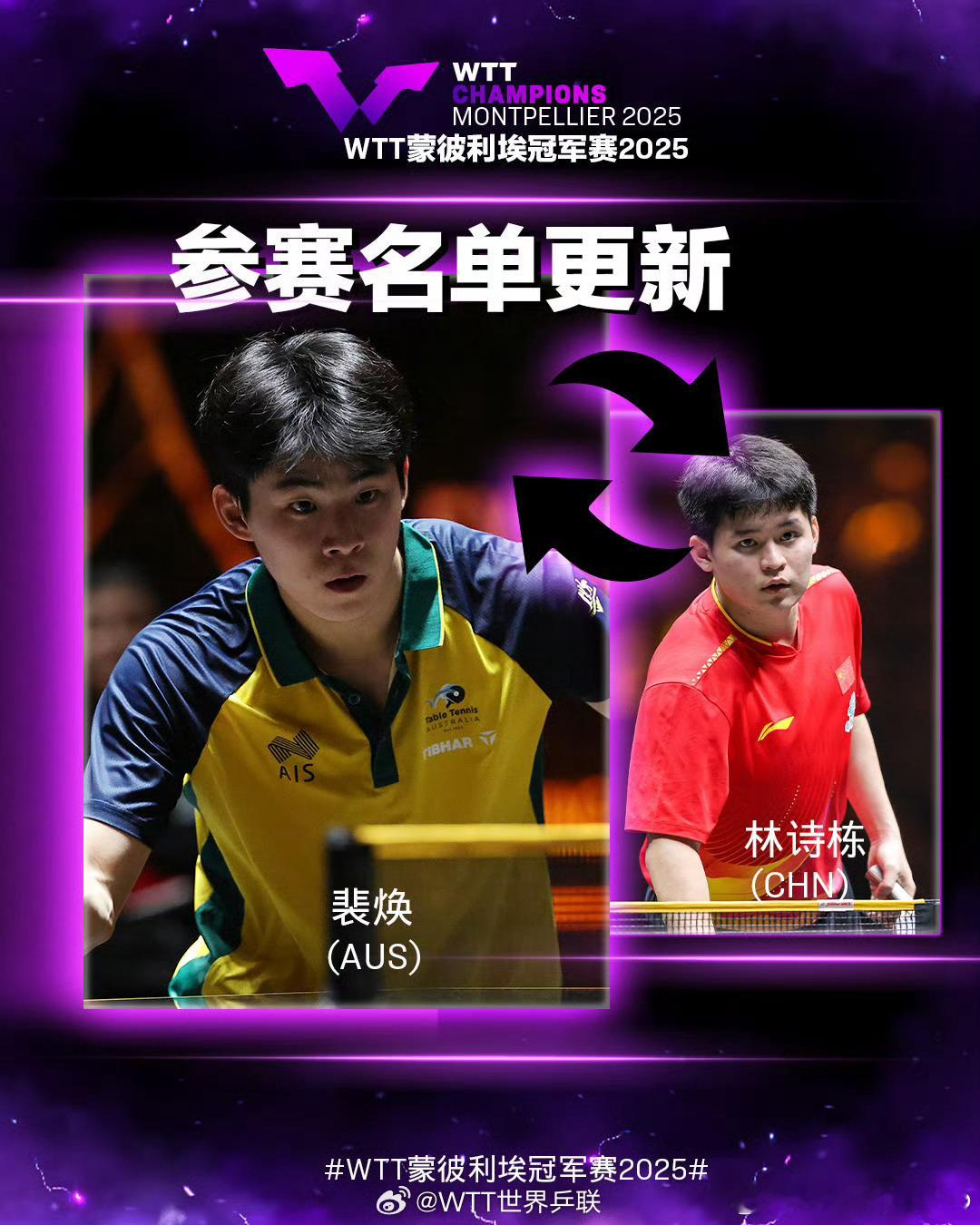 🇨🇳林诗栋退赛,🇦🇺裴焕递补
