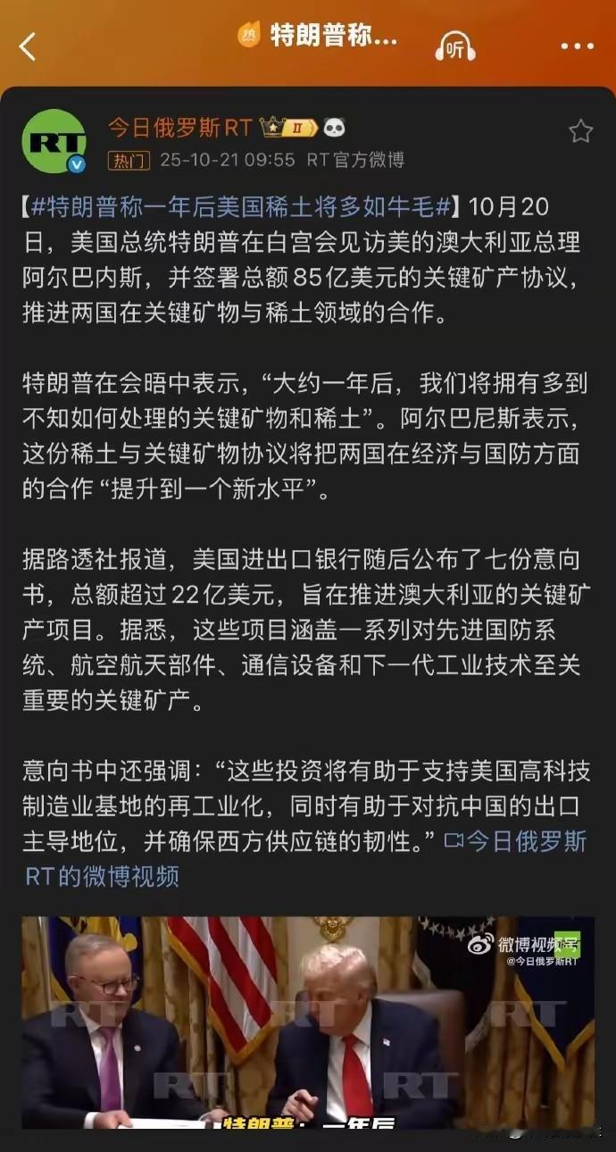 特朗普现在估计肠子都悔青了! 他后悔的不是夸下海口,也不是豪掷10亿美元全球囤稀土,而是低估了中国稀土技术卡脖子的威力。 特朗普最近拉着澳大利亚签了85亿美元的矿产协议,扬言一年后美国稀土多到无处存放。可现实是,美国唯一在产的芒廷帕斯矿,挖出的矿石八成得运到中国加工,再高价买回成品。白宫砸钱囤矿,却绕不开中国占全球90%的稀土精炼产能。 美国军工库存告急,F-35战机产线等米下锅,五角大楼连拆旧战机磁体救急的招都用上了。特朗普想靠美澳联盟破局,但澳洲稀土矿砂过去全依赖中国冶炼,新建工厂成本高中国三成,投产至少三年。更扎心的是,中国已把稀土生产设备和萃取剂纳入出口管制,美国就算有矿也提不出高纯度材料。 这回的牛皮吹破了。美国缺的不只是矿,是几十年积累的产业链和技术工人。