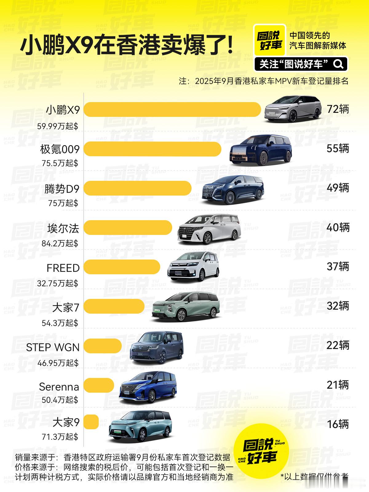 小鹏X9在香港的月销量又一次超越埃尔法,登顶9月豪华MPV销量榜首,并以193辆的上牌量成为香港第三季度豪华MPV上牌量第一,斩获9月及第三季度豪华MPV双料销冠。凭借领先的智能驾驶系统与舒适豪华的驾乘体验,小鹏X9正成为越来越多港区家庭与商务用户的首选。2025年,小鹏X9已完成马来西亚、新加坡、泰国、印尼及中国澳门、香港的正式上市,并在印尼完成本地化生产。
