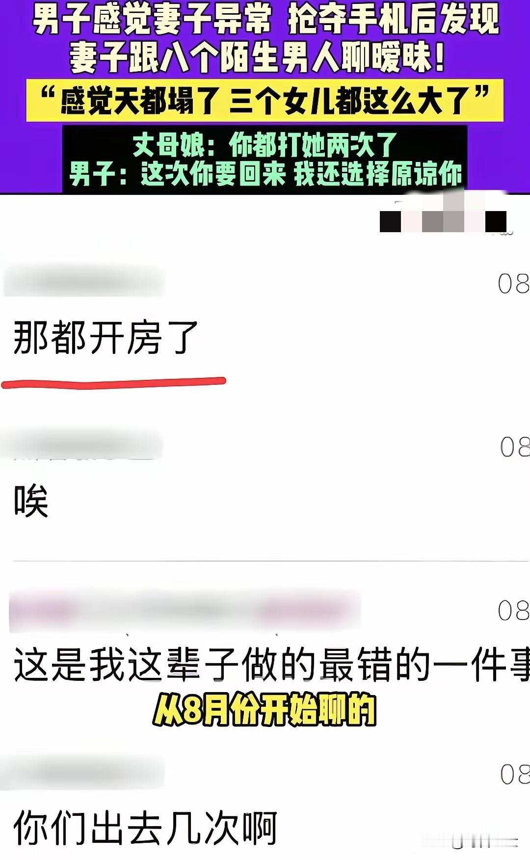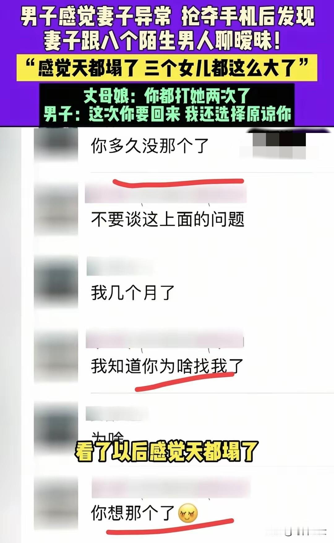河南开封,男子发现妻子不对劲,把她手机抢过来一看,她跟8个陌生男人聊暧昧,叫别人老公,还偷偷跟男人见面,男子感觉天都塌了!三个女儿都这么大了,妻子竟然给自己戴绿帽,气的他动手打了妻子,没想到,妻子说那就离婚,便离家出走,丈母娘指责男子:你都打了她2次了,男子无奈喊话妻子:为了孩子,你这次回来,我原谅你。男子还说自己也有错? 他蹲在小区门口的石墩上,手里攥着给小女儿买的草莓糖,糖纸被捏得沙沙响。卖水果的张姨递来杯温水:“去丈人家了吧? 人家姑娘叉着腰骂,说再敢动手,就报警抓你。”他灌了口温水,喉咙哑得慌:“我就是看见那些‘老公’俩字,血往脑门上涌——三个孩子喊她妈的时候,她咋能笑着跟别人发腻?” 楼上王姐跟邻居嚼舌根:“他媳妇早有苗头,去年冬天总晚归,问他就说‘同事聚会’,他天天跑长途拉货,哪顾得上盯?现在倒好,出了事全骂男的。 ”可不是嘛,街坊们私底下都嘀咕——女的把婚姻当摆设,男的把情绪攒成拳头,俩人都没把这日子当回事儿。 男子后来还是去了丈母娘家,站在台阶下攥着给孩子买的饼干,看着窗户里的灯亮着,却不敢敲门。 丈母娘隔着防盗门喊:“想让她回来?写保证书,再打她一次我跟你拼命!”他张了张嘴,想说“我也错了”——可错在哪儿?错在没早发现妻子的疏远?还是错在把“赚钱养家”当成了不爱她的借口? 其实最苦的是三个孩子。小女儿放学拽着他衣角:“爸爸,妈妈啥时候回来?”大女儿偷偷塞给他张纸条:“别恨妈妈,但她最近确实总抱着手机哭。 ”男人才明白,婚姻里的烂,从来不是一个人的错——他以为赚钱就是尽责,她以为孤单就是自由,到最后,俩人都输给了“没好好说话”。 他喊“为了孩子原谅”,可孩子要的不是“爸妈凑一块儿”,是屋里有笑声,是妈妈能好好抱她们,是爸爸能好好跟她们说话。 这“原谅”不是妥协,是得俩人坐下来,把藏了好几年的委屈倒出来——男的得说“我没在意你的难受”,女的得说“我没守住做老婆的本分”。 不然就算人回来了,心里的墙还在,迟早还得塌。 各位读者你们怎么看?欢迎在评论区讨论。