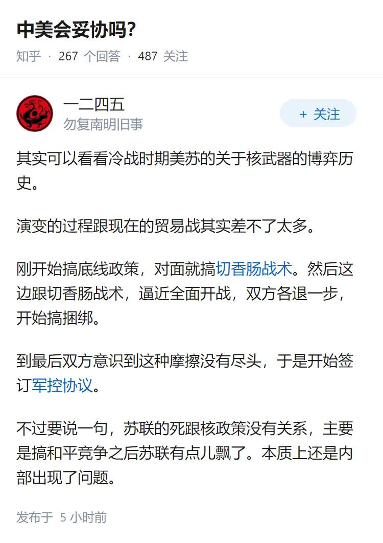 二战后美国能做到的事,很多现在的美国都做不到了。不管是热战还是贸易战,打的目的始终是为了谈,能谈多少就看你能打下来多少。只会有暂时的休战,不会有根本的妥协。双方的竞争已经到了必须决出胜负的阶段。这事本就不是中国的问题,是美国愿不愿意放弃对付中国。答案是否定的,所以早日放弃幻想,拿起武器才是真的。