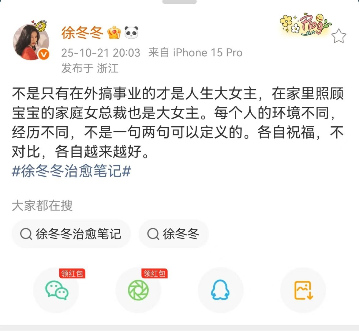 徐冬冬不是搞事业的才是大女主 把家经营成温暖的港湾,把孩子教育得知书达理,这样的“家庭女总裁”同样值得敬佩。人生没有标准答案,活出自己想要的样子就是成功 ​​​