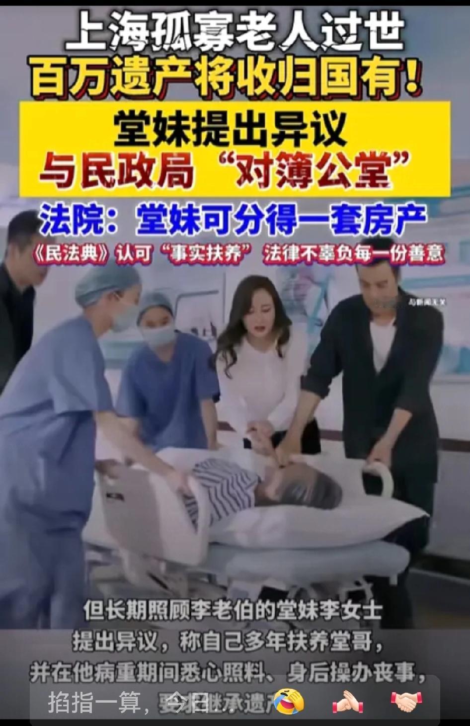 为这样的法院点赞👍👍👍👍👍👍 2025年7月,上海杨浦区法院审理了一起特殊的遗产案。 孤寡老人李老伯去世后,留下了超过百万的遗产。李老伯没有法定继承人,按照法律规定,原本这些遗产将收归国有,但李老伯的堂妹李女士却不甘心,她来到法院,要求继承遗产。 李女士说,她是李老伯的堂妹,多年来一直照顾李老伯生活,并且出资雇人打扫卫生、做饭。李女士还拿出了证据,证明自己照顾过李老伯,雇人打扫卫生、做饭的费用也是她支付的。 法院审理认为,根据《民法典》规定,未有法定继承权但对被继承人扶养较多的人,可以适当分遗产。 李老伯的堂妹李女士,就照顾李老伯生活、出资雇人打扫卫生、做饭等情况来看,确实对李老伯有扶养关系,并且扶养较多。 李老伯生前没有家人,也没有亲戚朋友,他的遗产应当由对他有扶养关系的人继承。 李老伯的遗产,应当由李女士继承一部分。 法院判决李老伯的一套房产判给李女士。 此案一经发出,网友纷纷表示,这才是法律该有的态度,善良绝不会被辜负。 法律认可善良的行为,不管是出于何种动机,只要做了善良的事情,终究会得到善良的回报! 对此,您怎么看?欢迎您在评论区留言