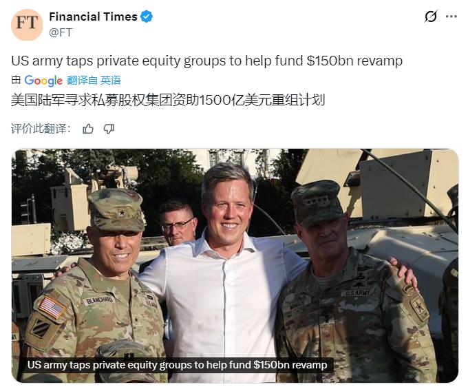 金融时报:美国陆军寻求私募股权集团资助1500亿美元重组计划! 网友:如果我理解