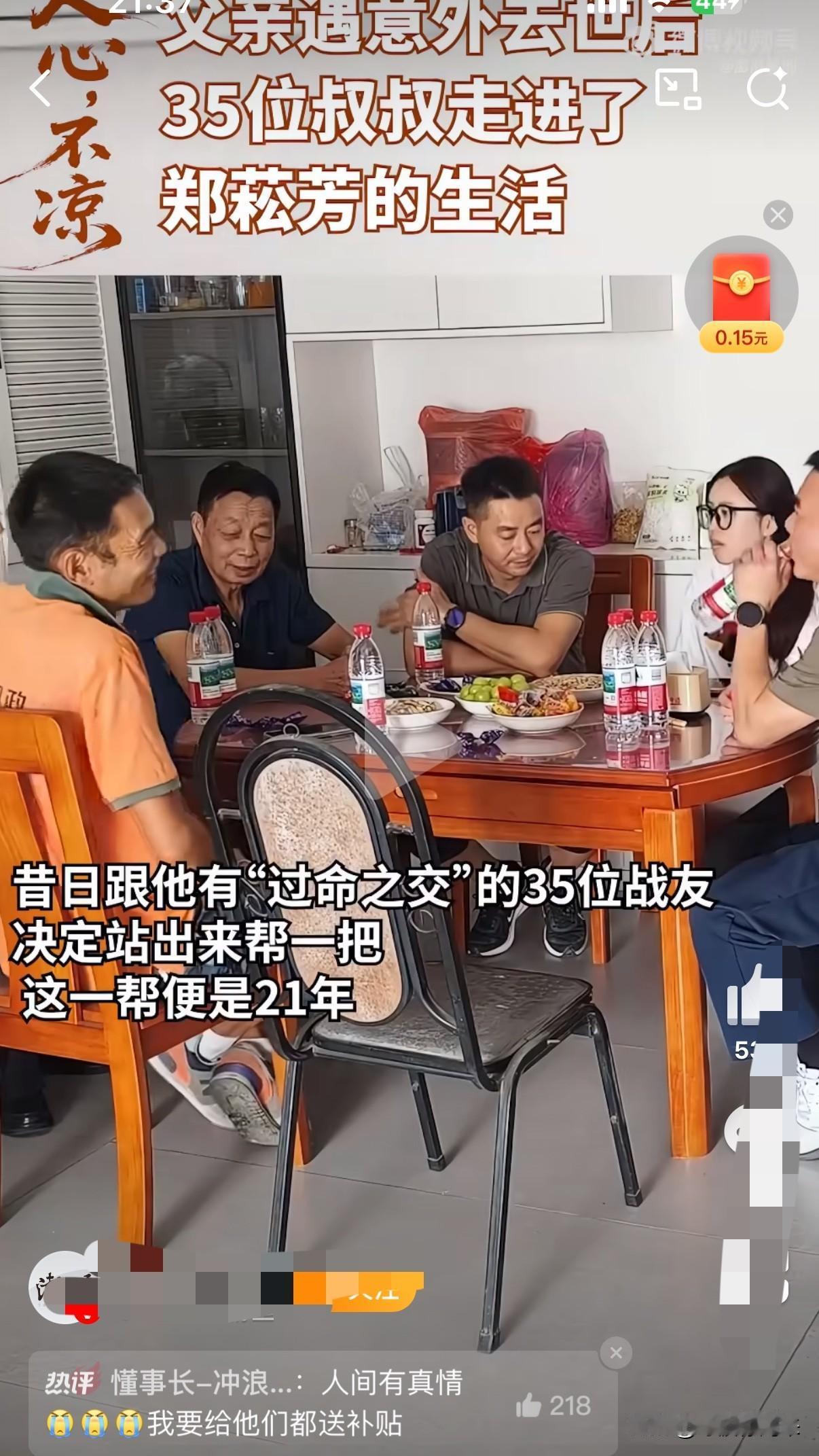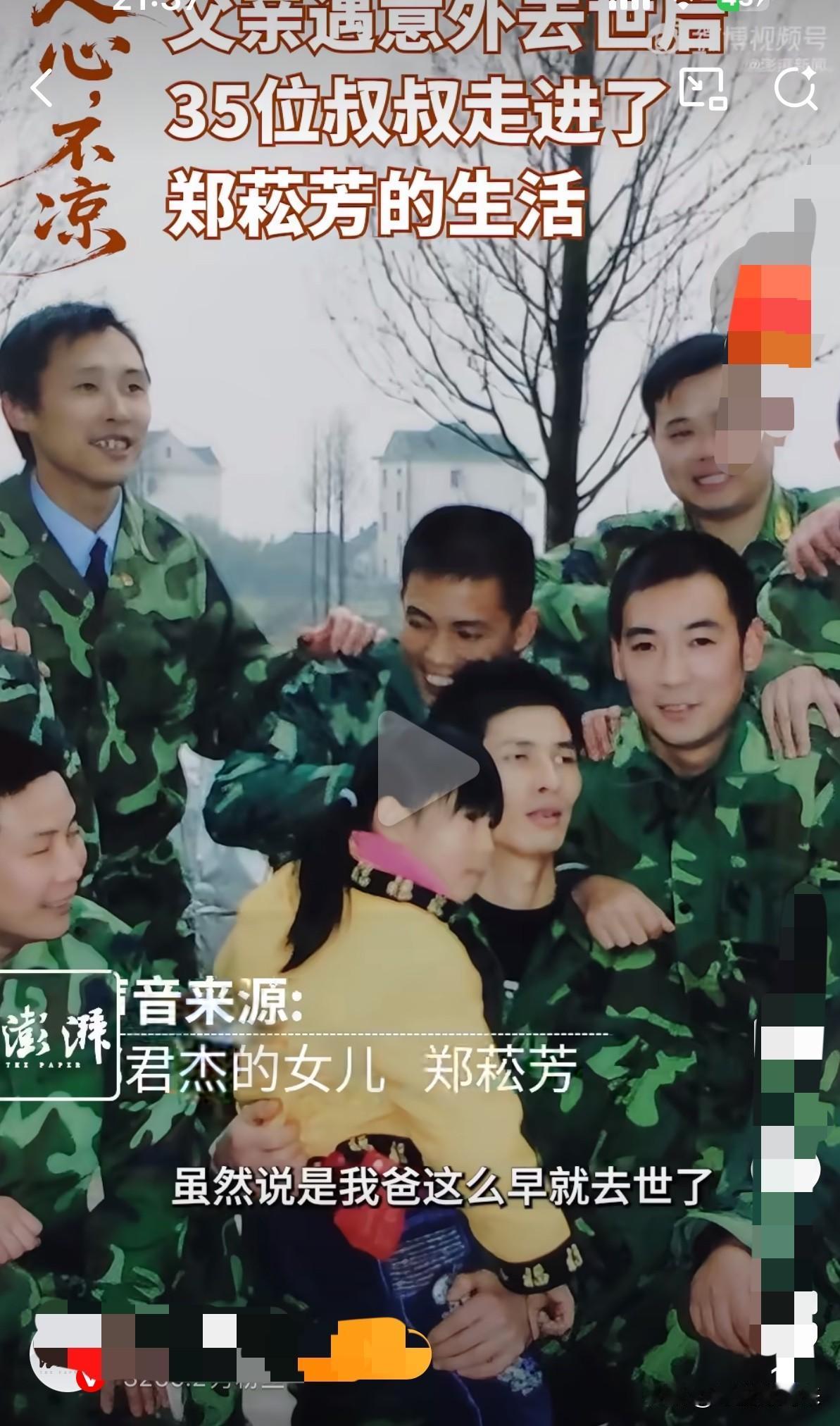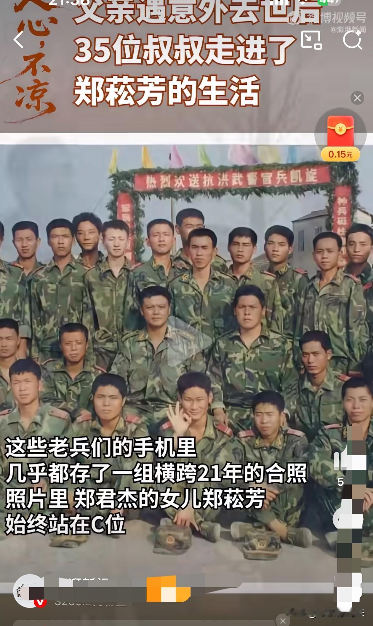 为何眼中常含热泪,因为人间值得,总有一些事感动着我们! 21年前的一场意外车祸,带走了一个三岁女娃的爸爸——退役军人郑君杰!从此留下了孤儿寡母和他年迈的父母! 小女娃叫郑菘芳,当初对爸爸毫无印象,只记得捧着遗像!如今她已出落得亭亭玉立!她的成长道路上,始终有35个爸爸守护!从当初的五六个人凑出一千多元,这可是他们当时的一个月工资啊!到后来35个人接力的齐心协力,支撑起了这个家! 整整坚持了21年!他们除送钱送物外,生活中把郑家的老人当作自己的父母孝敬,把郑菘芳当成亲生女儿疼爱。聚会时总不忘叫上他们,逢年过节必登门探望。 那张横跨21年的合影,记录着感人至深的故事——小姑娘从怯生生到眼神坚定,而那群年轻小伙子已两鬓斑白。 21年的坚守诠释了“战友”的份量,在物欲横流的今天,这份不是亲人胜似亲人的情谊,暖了人心,也让我们看到:人间真情,从来不曾远离。 可以想像,当郑菘芳披上嫁衣的那天,这35个“爸爸”定会哭成“泪人”——他们用半生时光,完成了对战友的承诺! 我们有理由相信:这世间,总有一些情义,总有一些人,值得用一生去守护!