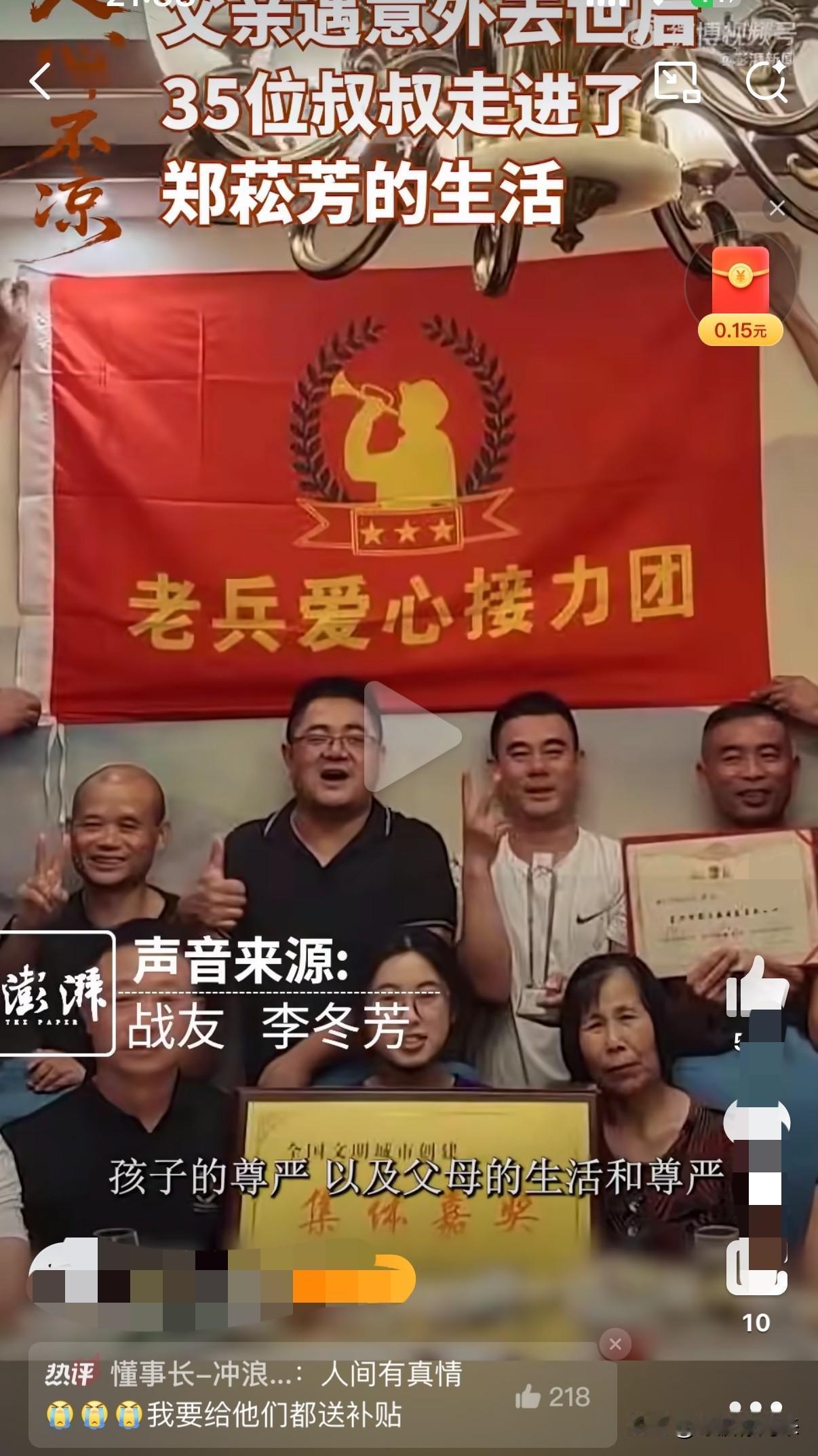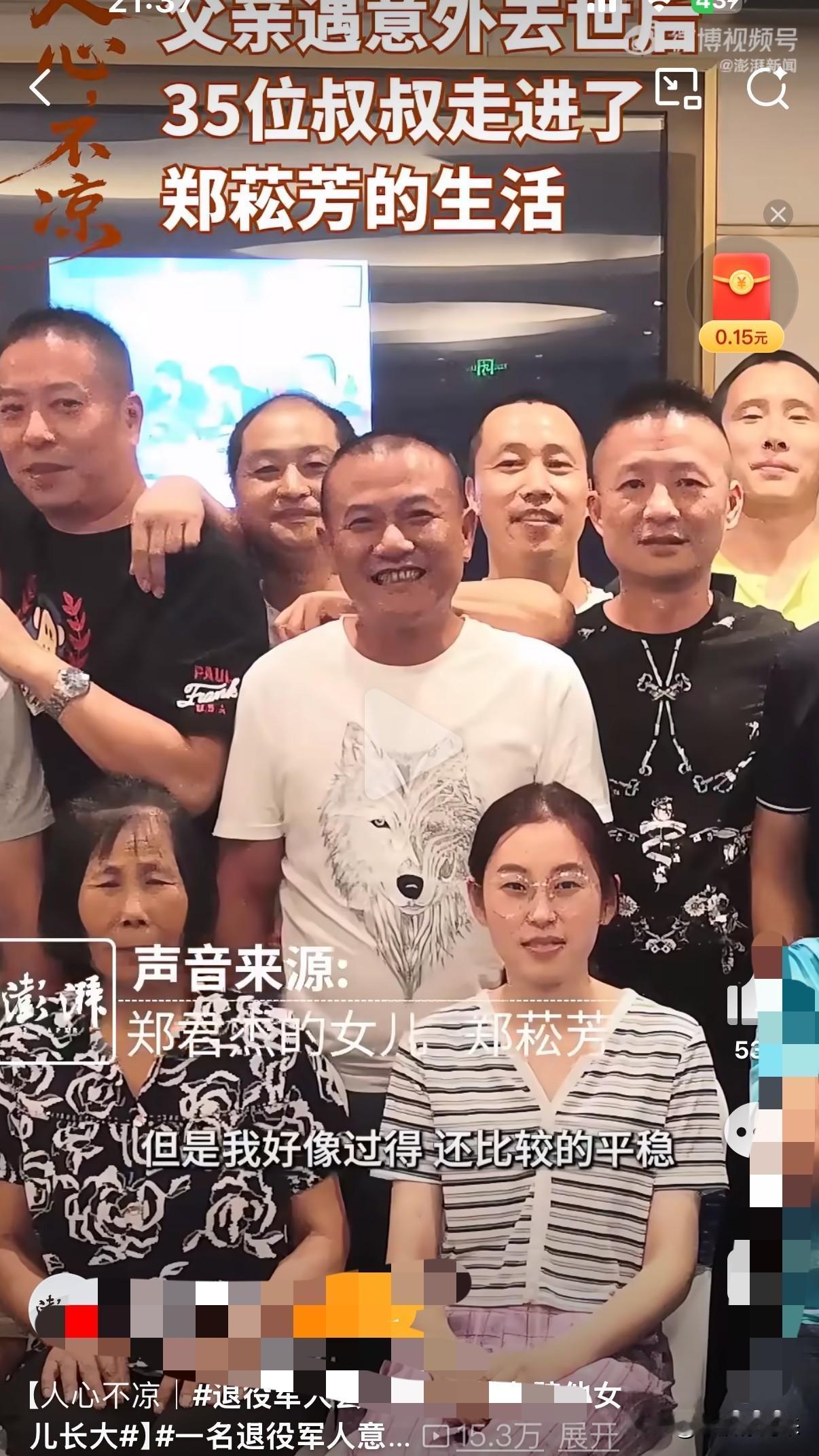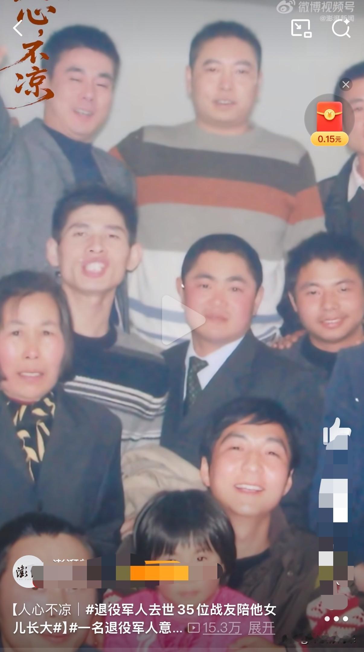 为何眼中常含热泪,因为人间值得,总有一些事感动着我们! 21年前的一场意外车祸,带走了一个三岁女娃的爸爸——退役军人郑君杰!从此留下了孤儿寡母和他年迈的父母! 小女娃叫郑菘芳,当初对爸爸毫无印象,只记得捧着遗像!如今她已出落得亭亭玉立!她的成长道路上,始终有35个爸爸守护!从当初的五六个人凑出一千多元,这可是他们当时的一个月工资啊!到后来35个人接力的齐心协力,支撑起了这个家! 整整坚持了21年!他们除送钱送物外,生活中把郑家的老人当作自己的父母孝敬,把郑菘芳当成亲生女儿疼爱。聚会时总不忘叫上他们,逢年过节必登门探望。 那张横跨21年的合影,记录着感人至深的故事——小姑娘从怯生生到眼神坚定,而那群年轻小伙子已两鬓斑白。 21年的坚守诠释了“战友”的份量,在物欲横流的今天,这份不是亲人胜似亲人的情谊,暖了人心,也让我们看到:人间真情,从来不曾远离。 可以想像,当郑菘芳披上嫁衣的那天,这35个“爸爸”定会哭成“泪人”——他们用半生时光,完成了对战友的承诺! 我们有理由相信:这世间,总有一些情义,总有一些人,值得用一生去守护!