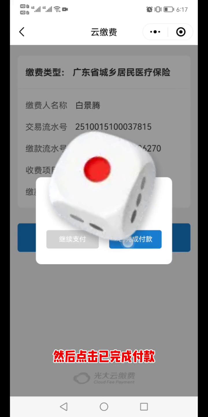 2026年城乡居民医疗保险费用清缴流程。 教你在网上缴纳2026年城乡居民医疗保险费用。 ·在粤省市微信小程序点击搜索粤税通,点击搜索,点击进入粤税通。 ·选择城市,比如韶关市或者东莞市,然后点击登录,点击确定,点击允许。 ·点击人脸识别登录,勾选我已阅读并同意,开始人脸识别验证,点击已知悉,点击下一步。 ·人脸识别按照提示眨眼睛,通过之后点击返回粤税通,确定。 ·点击城乡居民社保,点击城乡居民社保费清缴,选择险种,城乡居民医疗保险,确定。 ·选择缴费类型,如果是本人就选择本人缴费,如果是为他人缴费点击为他人缴费,点击确定,点击下一步。 ·如果之前交过费用的就点击常选择常用联系人,确定。 ·如果没有交过就要点击输入姓名,选择身份证,然后再输入身份证件号码,选择险种,点击城乡居民医疗保险,确定。 ·然后勾选要清缴的城乡居民保险费用的人,勾选,然后点击缴款,这里可以选择医保个账支付和微信缴款,这里我就演示微信缴款,点击等待几秒,然后点击阅读完毕,然后点击去支付,然后点击立即支付,然后输入密码,然后点击完成,然后关闭。 缴费类型:广东省城乡居民医疗保险。然后点击已完成付款,这里就显示已经支付成功了,然后点击确定,这里显示已经清缴成功了。 这样2026年的城乡居民医疗保险费用就已经清缴成功了。 喜欢我的视频可以点个小爱心,转发到亲朋好友,也可以点击关注,评论,下期视频分享,再见拜拜。